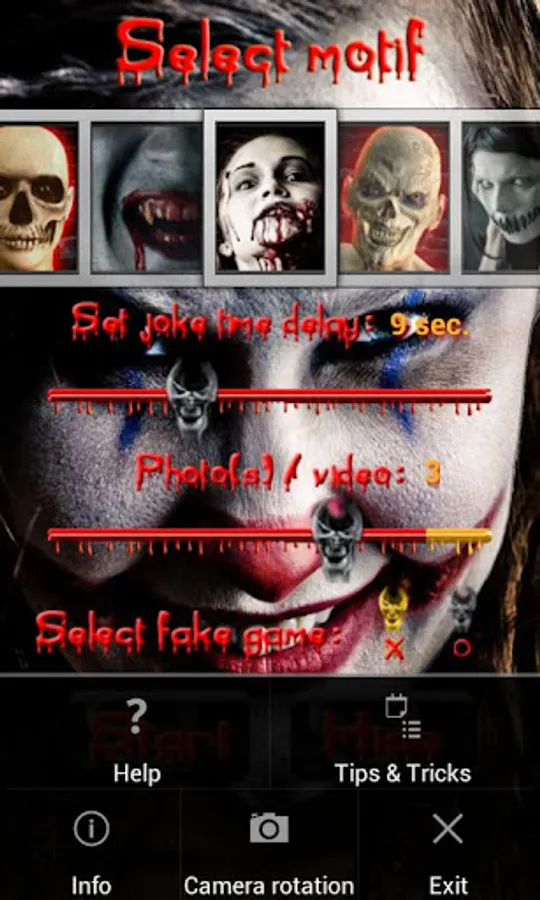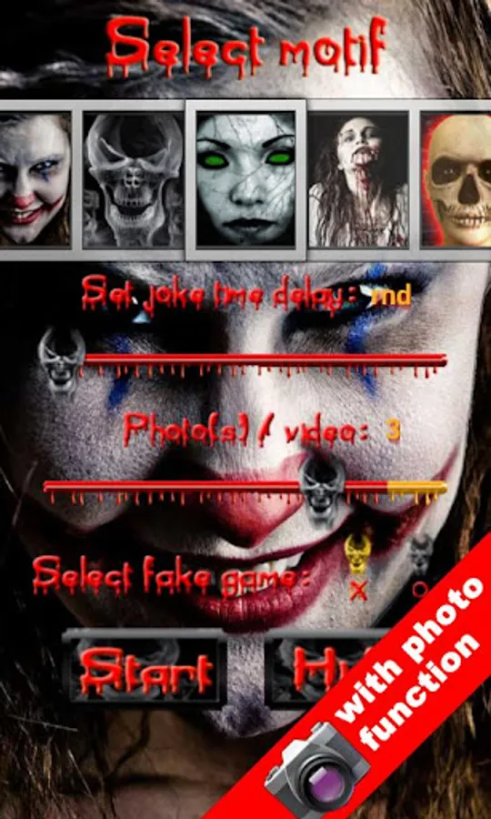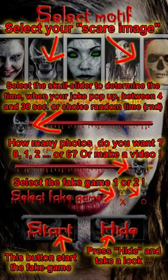 After a certain period of time (randomly selected or freely selectable between 4 and 30 seconds) a terrifying high definition image suddenly appears, associated with the roar of a monster or a scream that will scare others to the bone. Additionally, vibration will be activated and a photo shot (up to 6).