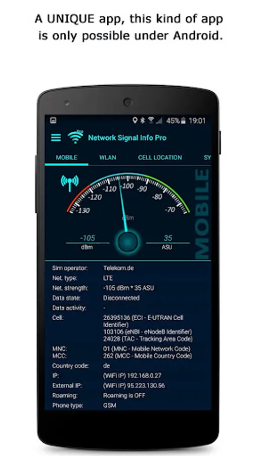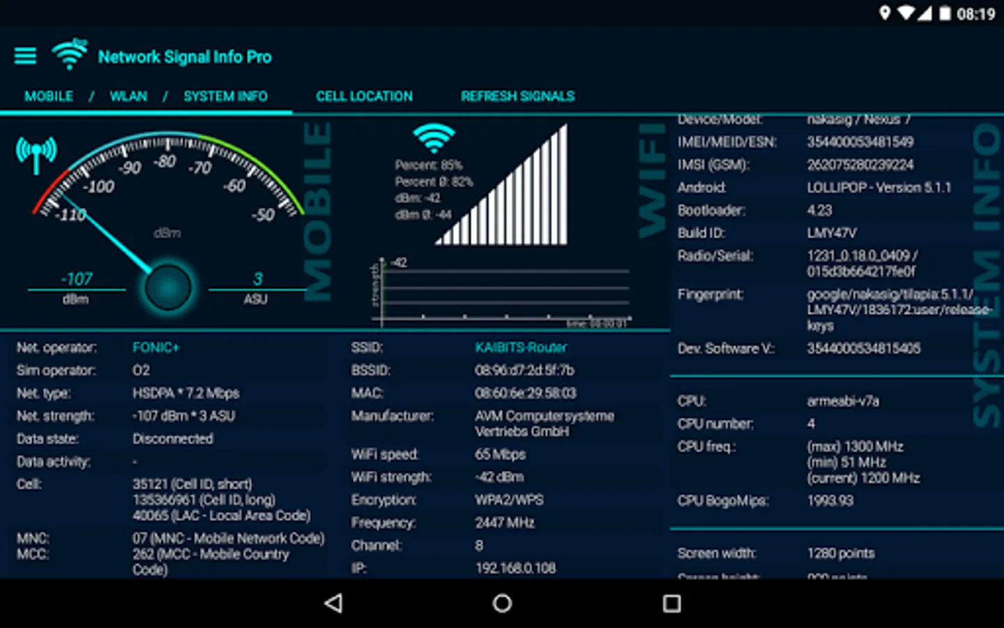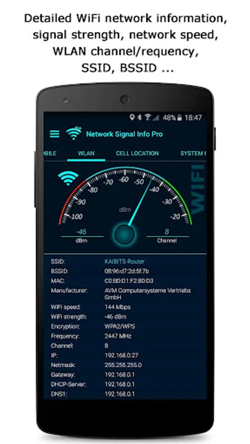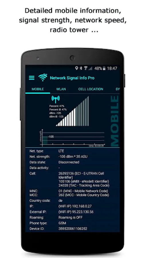 "Network Signal Info" provides detailed information over the currently used network with accurate signal strength output, whether WiFi (WLAN) or cellular (mobile) connection and is easy to use.