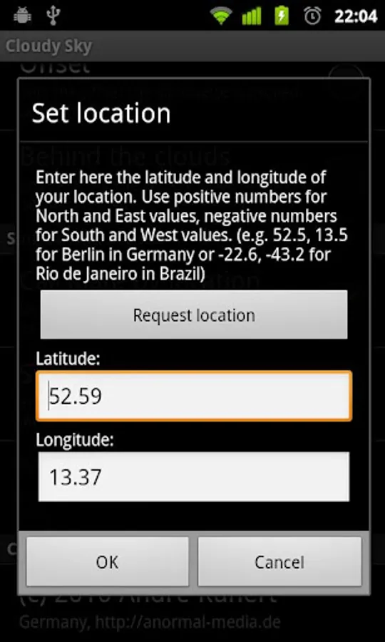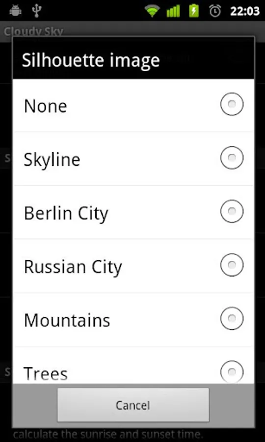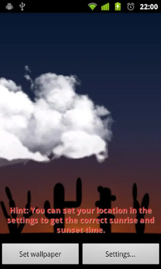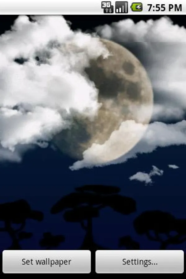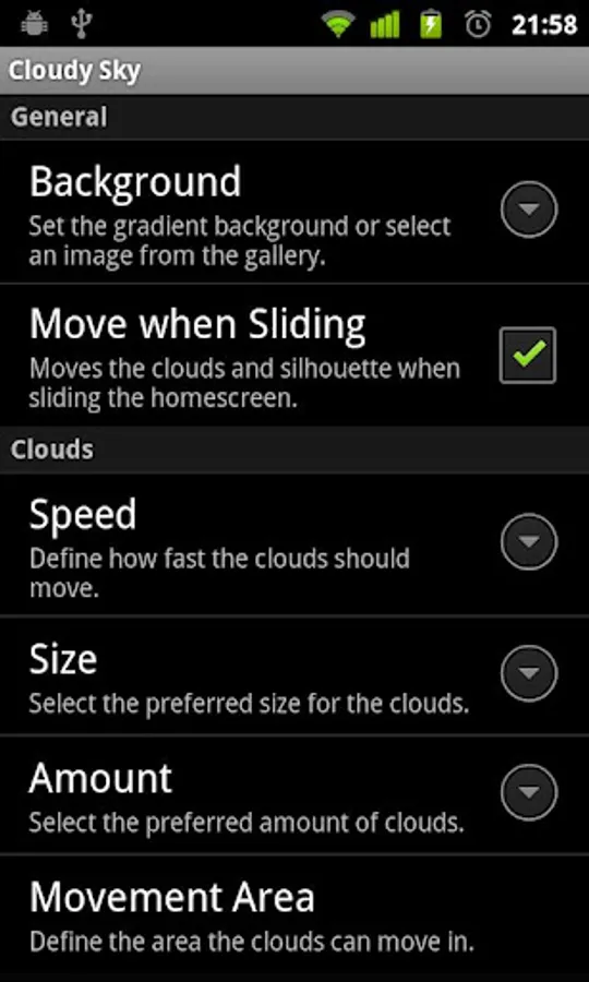 A live wallpaper showing moving clouds in the sky. Optional sun, moon and silhouette. An own background image can be set. Highly customizable.
