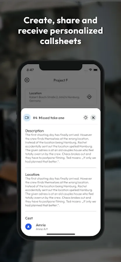Use this app, call sheets are personalized. Intuitive to read. And beautifully designed. Plus, never be worried again about missing important information - you will receive push notifications, if changes to your call sheet have been made.