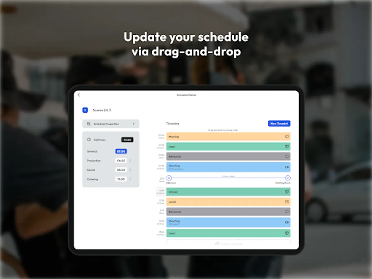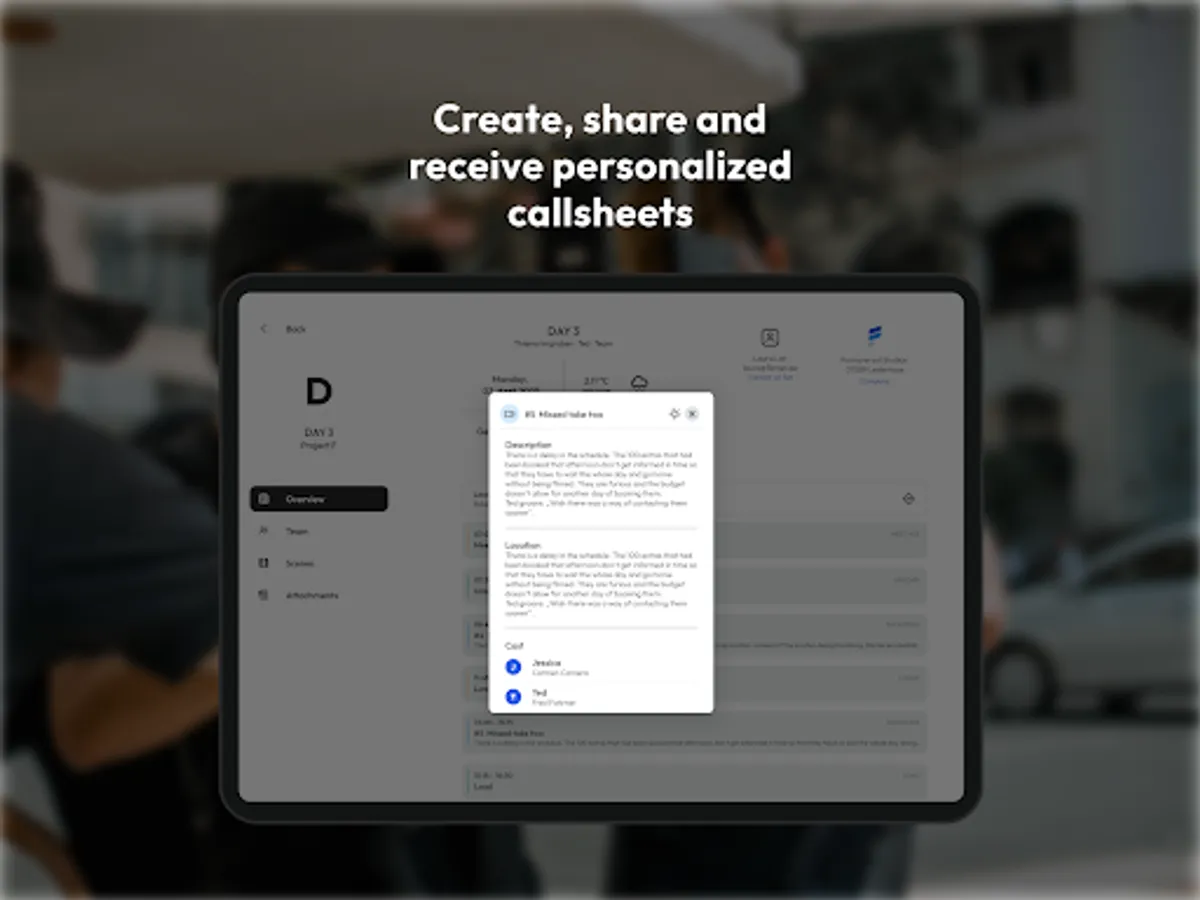 Use filmlet’s smart features (e.g. contact import, drag-and-drop and automatic time scheduling, & many more) to create call sheets in a snap.