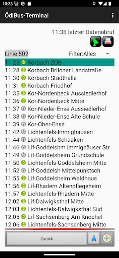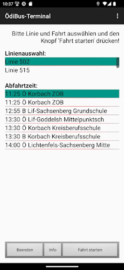 The ÖdiBus terminal is used for on-demand transport (one-way service and sector operation) that combine fixed stops and request stops. The driver selects the appropriate route and journey and receives an overview of which required stops must also be approached.