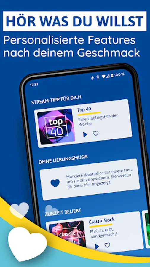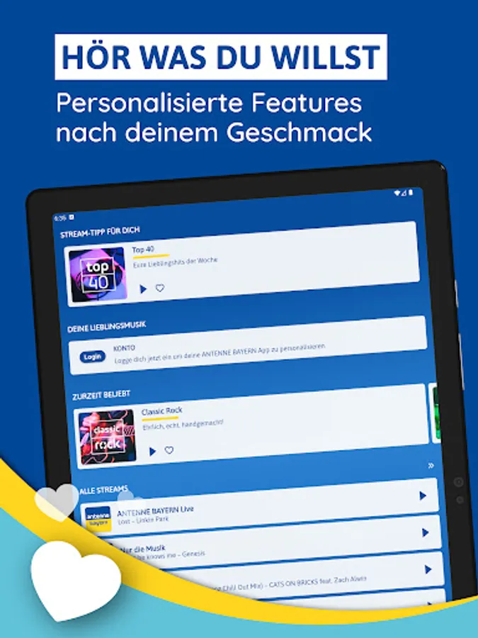 Welcome to the ANTENNE BAYERN app - your ultimate companion for web radio, podcasts, news, weather, traffic, radio charts, playlists, alarm clock and exciting promotions. Immerse yourself in the world of radio and experience Bavaria's best music mix paired with lots of entertainment and the latest news. Enjoy our high-quality web radio with a variety of web streams, including 70's hits, 80's hits, 90's hits, classic rock, black music, chillout and many more. Create your individual playlist and favorite your personal favorite streams and songs so that you can find them again at any time.