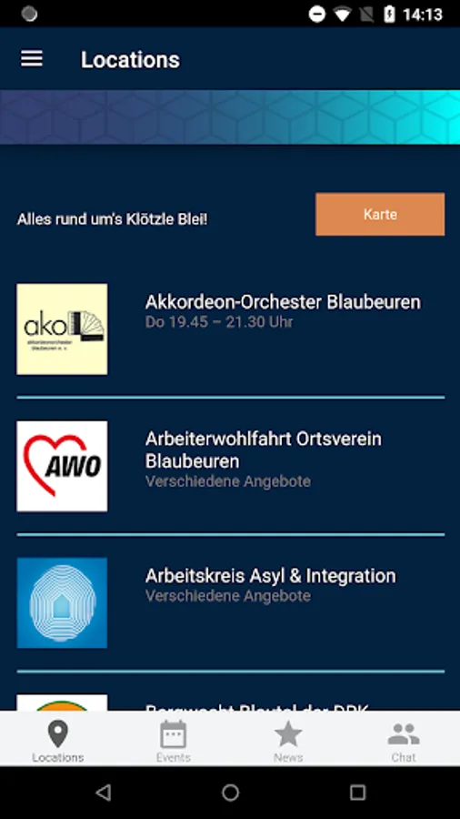 Everything about Klötzle Lead - Get to know your homeland Blaubeuren completely with BLUEZONE. We are the first youth app in the region. Here you can get to know the clubs and youth organizations in and around the city. A new hobby is right around the corner. And we have even more ideas for your free time: With our event calendar, chat groups for everything going on and current news you are always in the middle of it. Whether in the center of Blaubeuren, Gerhausen, Weiler, Asch, special book, Seissen, Beiningen, Pappelau, Erstetten or beyond. Ciao boredom. Try it right out. Have fun!