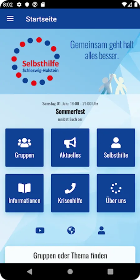 The app is operated jointly by all contact points for self-help groups in Schleswig-Holstein (SASK). It offers quick access to the local contact point and to the regional self-help groups on site. Those affected and self-help groups benefit from this. The app offers a nationwide overview of all topics, events and current information on community self-help. It connects experts from medical practices, clinics, universities and various advice centers etc. with the specialist staff from the contact points and the "personal experts" (those affected and relatives) from the self-help groups and organizations.
