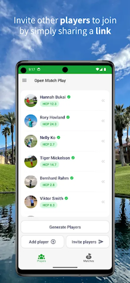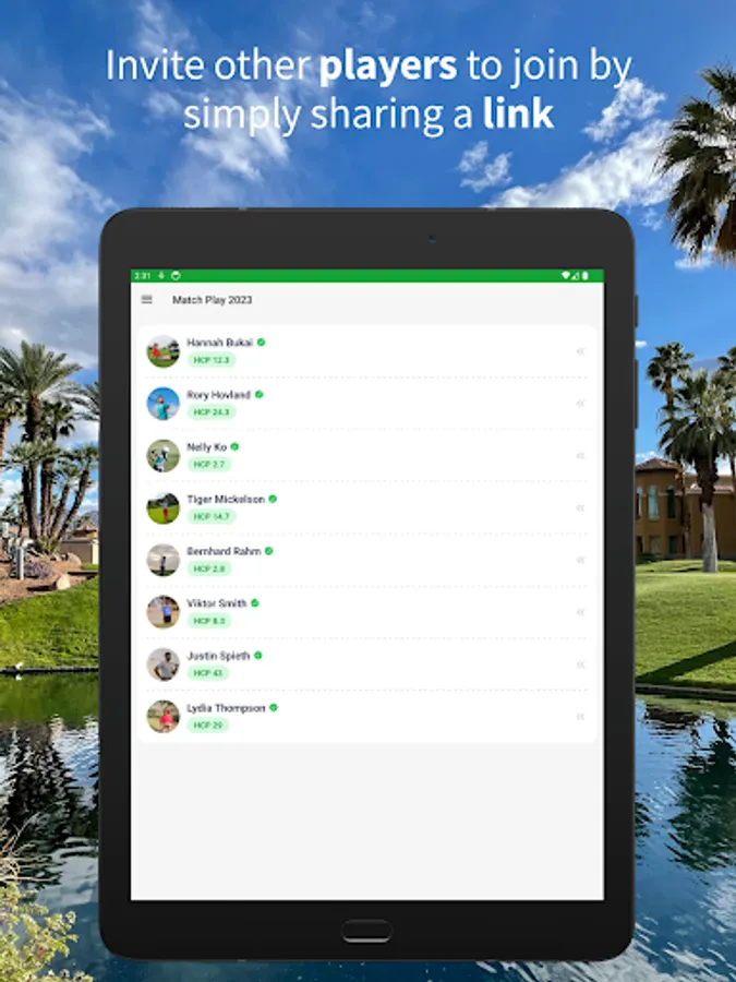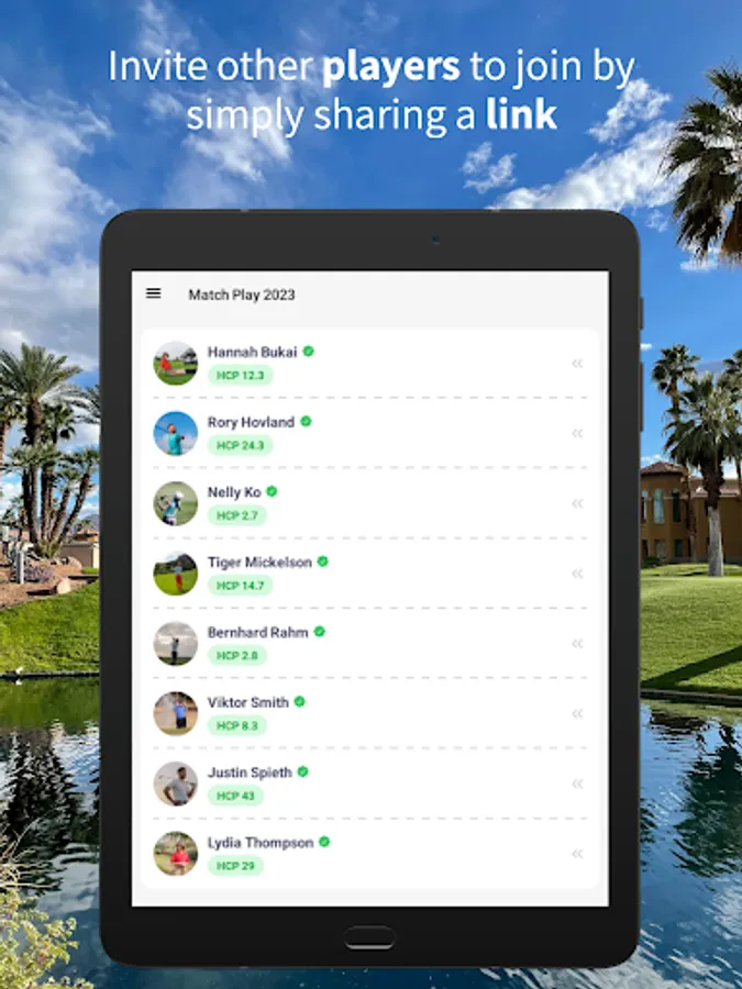With 1Up, creating your own tournament is a breeze. In just a few seconds, set up a match play tournament tailored to your preferences. Utilize the simplicity of a single link to invite your entire group or send personalized invitations to individual players. Need more control? Manage players manually, giving you the flexibility you desire.