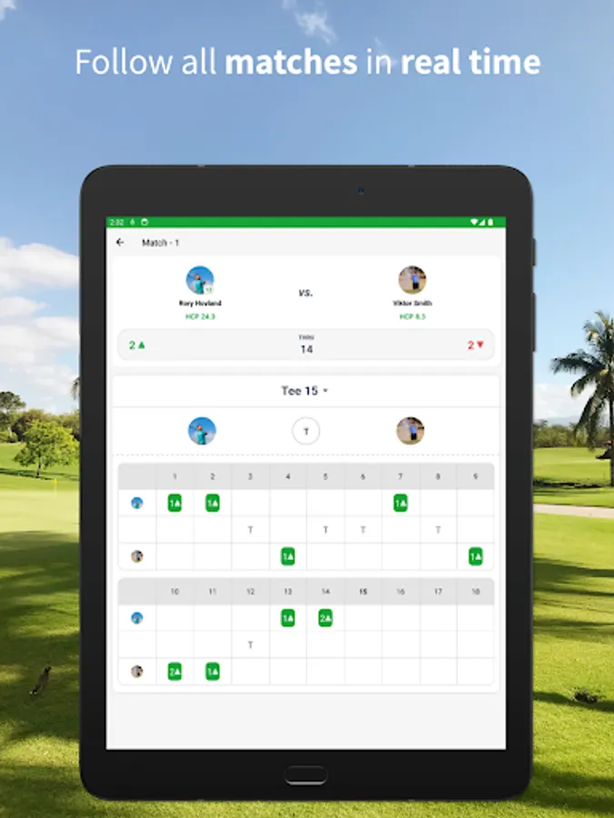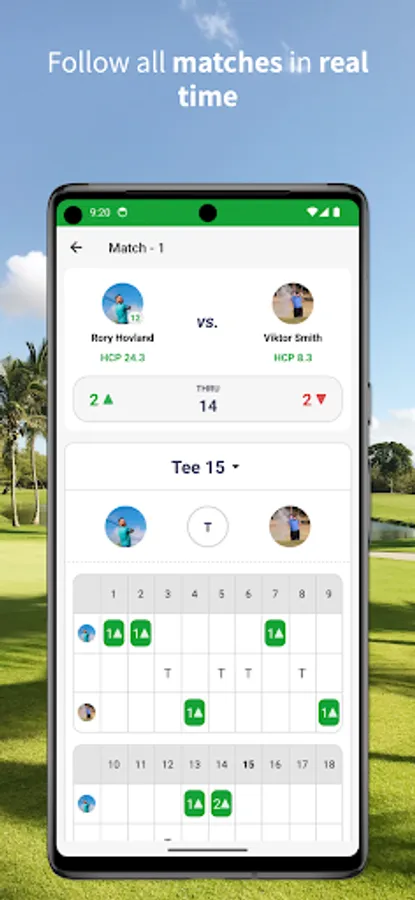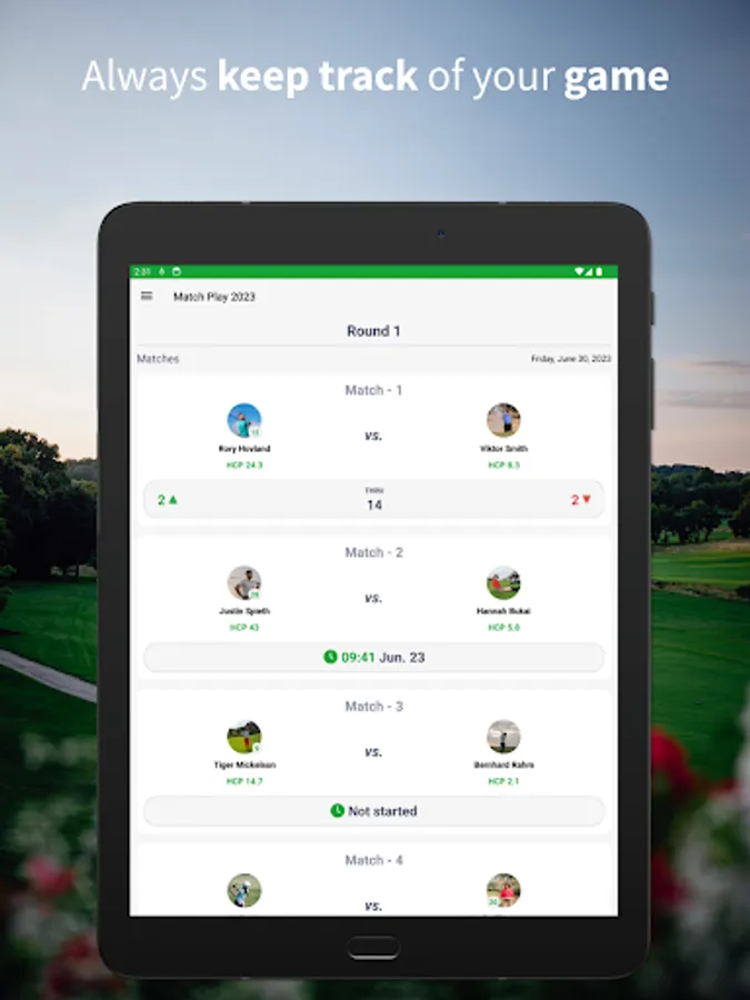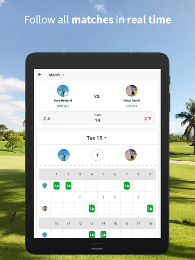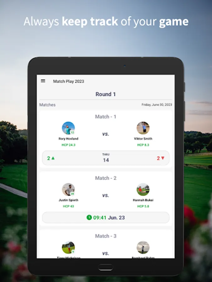 Say goodbye to pen and paper. With 1Up, participants can conveniently enter their tee times directly through the app, streamlining the process and eliminating confusion. During the game, players can effortlessly input scores for each tee, while others can follow the action in real-time through our virtual scorecard. Rest assured, the app will automatically generate match pairings for subsequent rounds, saving you time and effort.