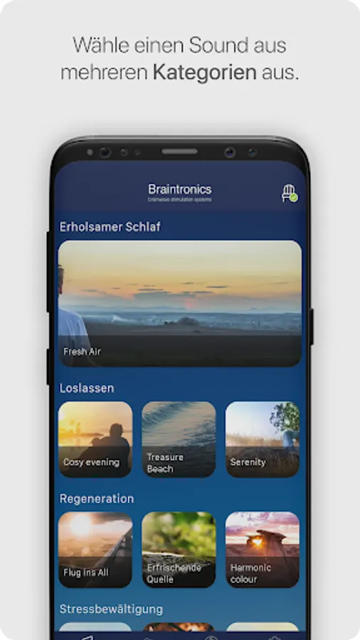 Finally you can switch off, leave your stress behind you and fully recover - who doesn’t long to do this after a tiring day at work? With the Braintronics relaxation app, total relaxation is only a few minutes away. Leave tension and restless thoughts behind you and look forward to glorious relaxation in the rhythm of your own breathing. Our app gently guides you through meditations which are accompanied by melodious music and binaural beats and which generate a deep state of relaxation in just a few minutes. If you use meditation techniques regularly, you can increase your stress resistance and improve your health in the long term.