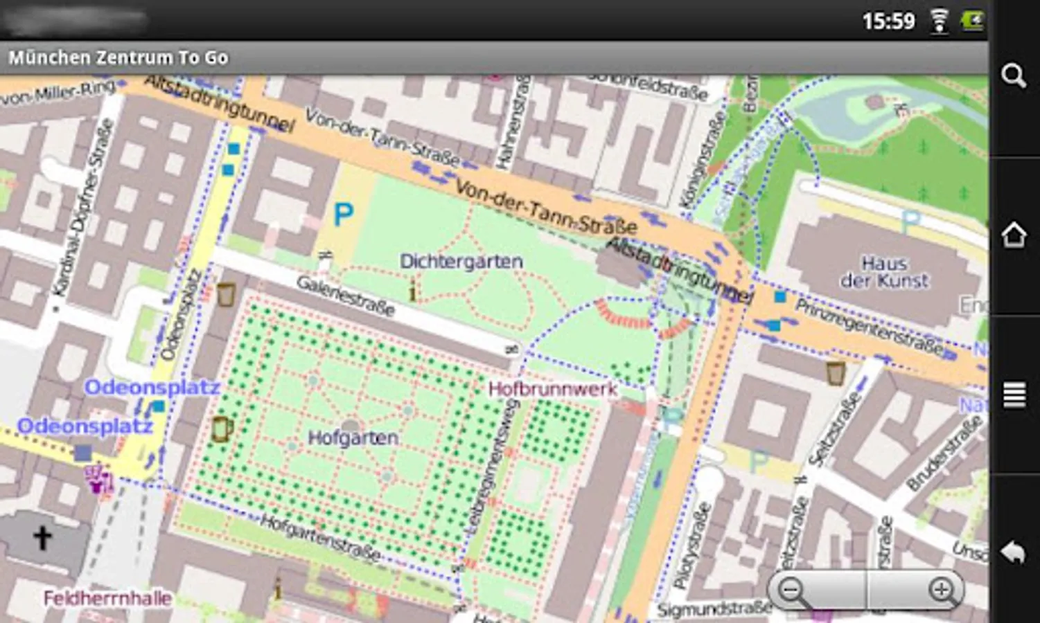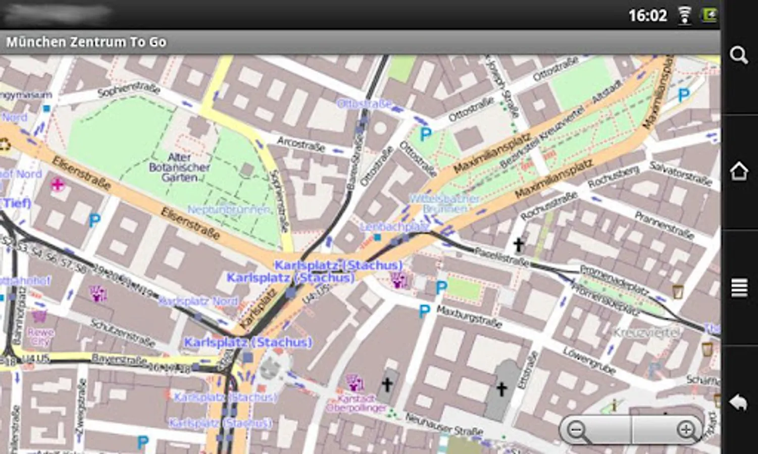 The map shows the center of Munich main train station, Stachus, Marienplatz, Gaertnerplatz, English Garden and a piece of the Theresienwiese. The view of the map can be zoomed and moved.