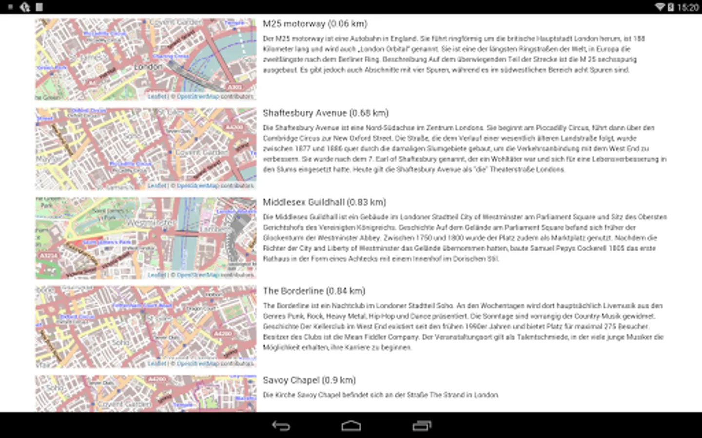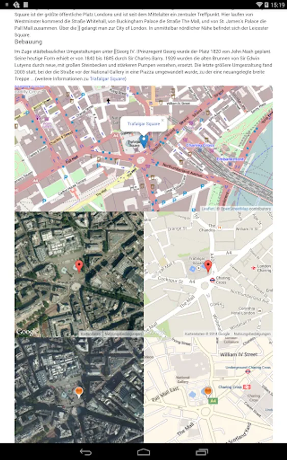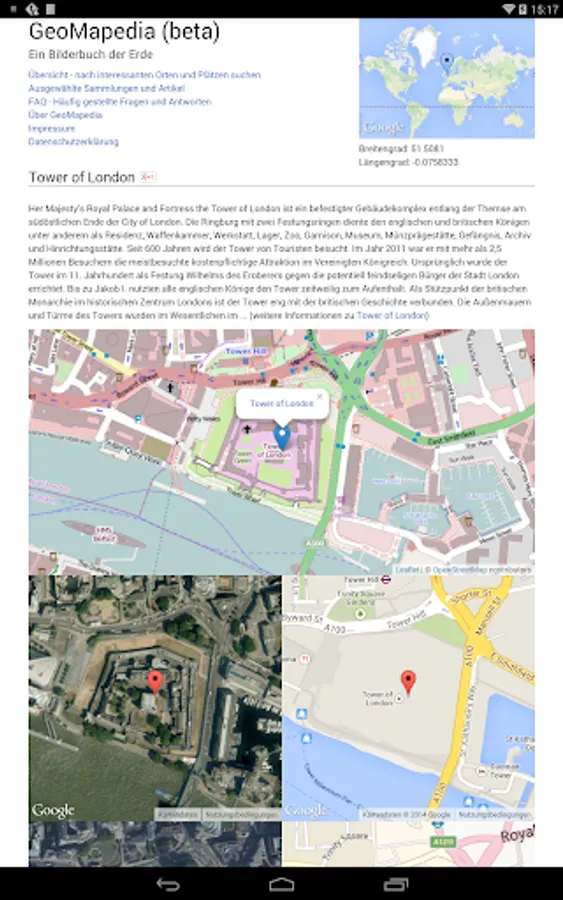 What kind of information is available? For every keyword you find not only a description but also maps from various sources delivered by Google Maps, Bing Maps or OSM (Open Street Map). These maps are shown side by side so that you can compare them easily. Furthermore you find links to interesting close by locations. Currently the English version of GeoMapedia includes more than 95000 entries.