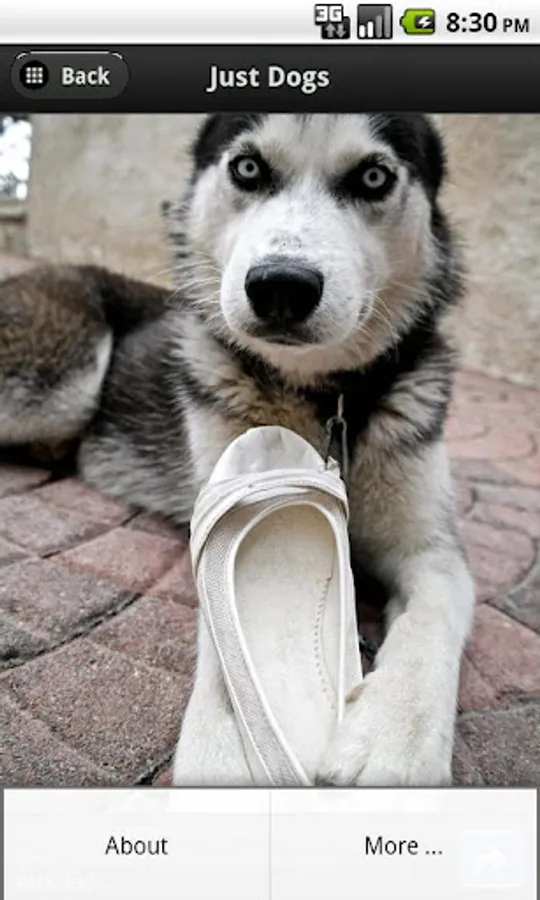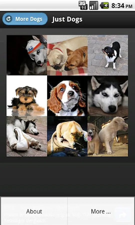 This app shows changing dog related images from the Flickr network (http://www.flickr.com). The 'More Dogs' button shows more dogs from the constantly updating Flickr stream.
