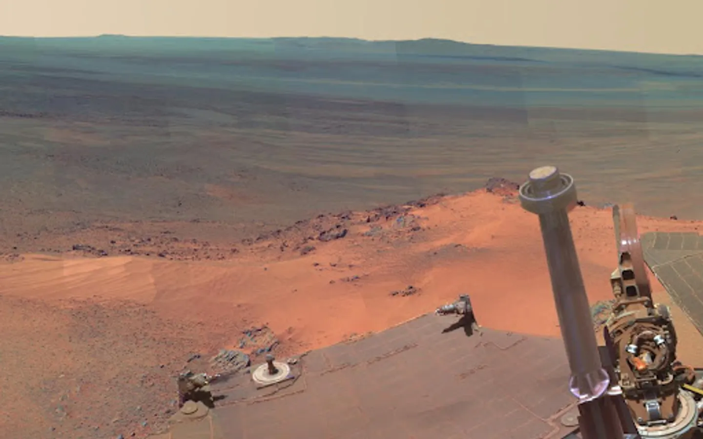 In 2004 the NASA probe "Opportunity" landed on planet Mars. Expected to work for three months the rover is still working after more than 3000 days. Using 817 single shots NASA employers created a giant panorama image measuring 5788 x 2000 pixels. This app lets you explore that image on your android device.