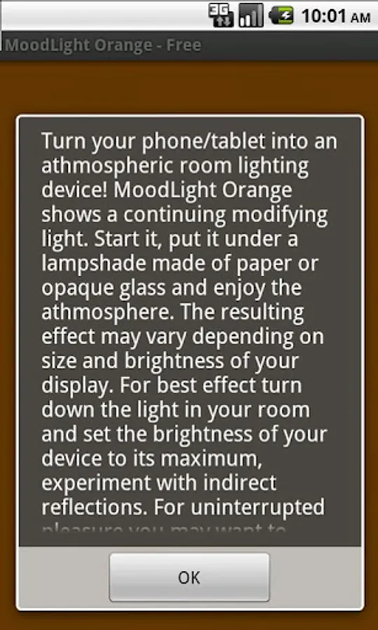 "MoodLight Orange - Free" shows a continuing modifying light. Start it, put it under a lampshade made of paper or opaque glass and enjoy the athmosphere. The resulting effect may vary depending on size and brightness of your display. For best effect turn down the light in your room and set the brightness of your device to its maximum, experiment with indirect reflections. Relax and enjoy!