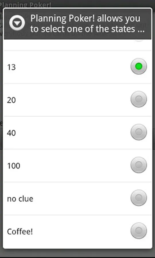 This is a very basic, straight forward and easy to use implementation of the Planning Poker card set which is used within the SCRUM project management strategy.