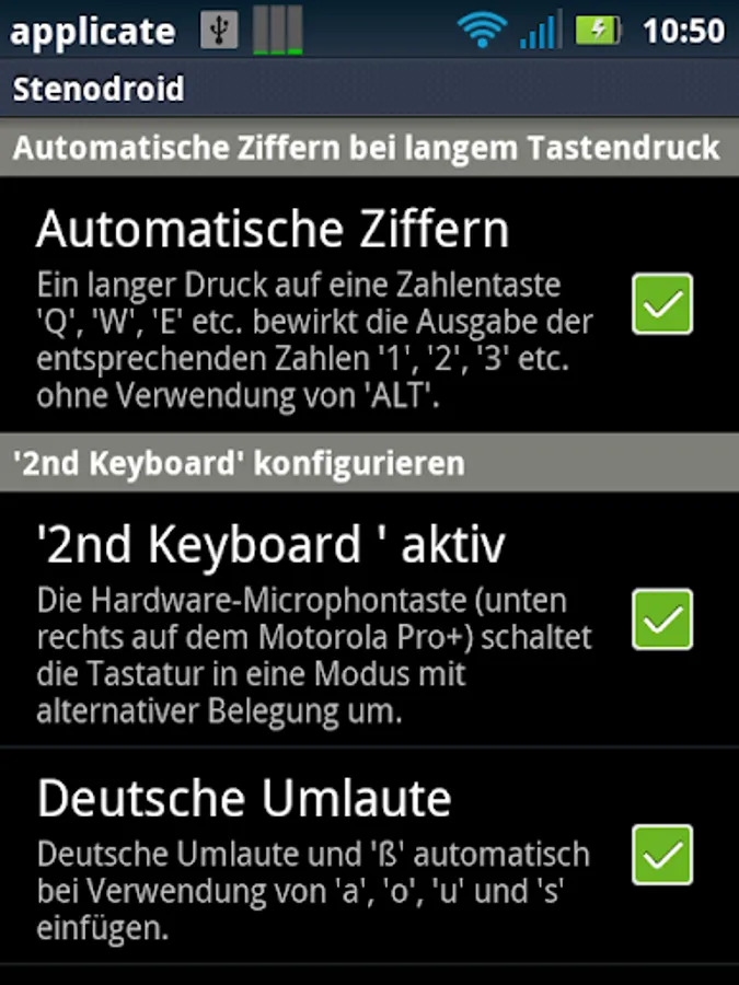 Simply faster write: The app has been developed and tested to provide the hardware keyboard of the device with extra features for the hardware keyboard of the Motorola Pro + (German version). If the app also supports other hardware keyboards, then the 'random' - I'm looking forward to appropriate feedback. For devices without hardware buttons will not operate this app, so please no bad reviews when the app on devices without hardware keyboard does not do anything ...