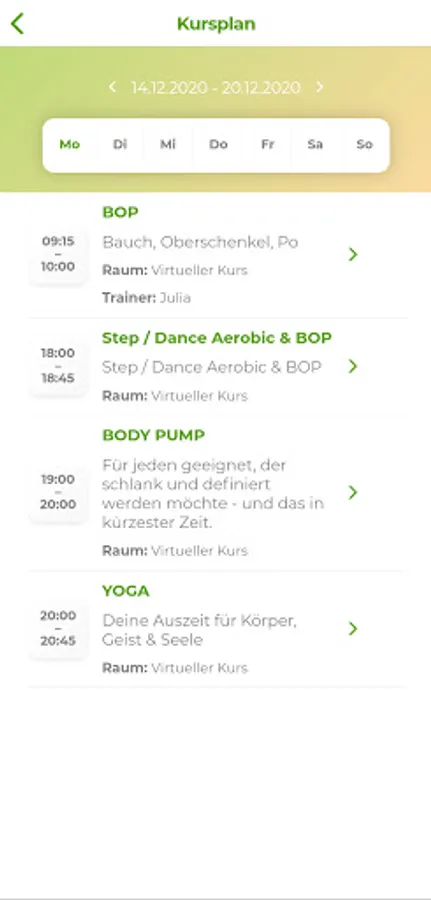 The current course schedule, you can at any time via the app to retrieve, so you're always informed when the course start. You will never again miss your favorite course.