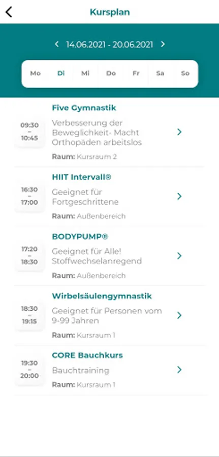 The current course schedule, you can at any time via the app to retrieve, so you're always informed when the course start. You will never again miss your favorite course.