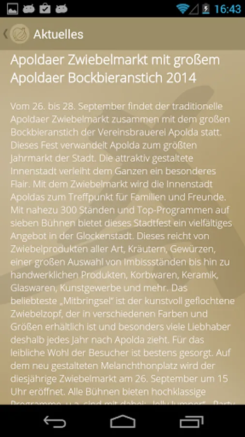 The official app for Apoldaer onion market. The whole program up to date available. See at a glance what's happening on stage, capture the scan function the QR code on the stage and then call the current program stage quickly and easily. Find people using our map function to theaters and other important places.