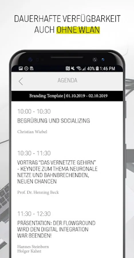 With many useful features such as uncomplicated registration, permanent availability even without WLAN and all information (agenda, room plans, participant lists, speaker information etc.) around our events.