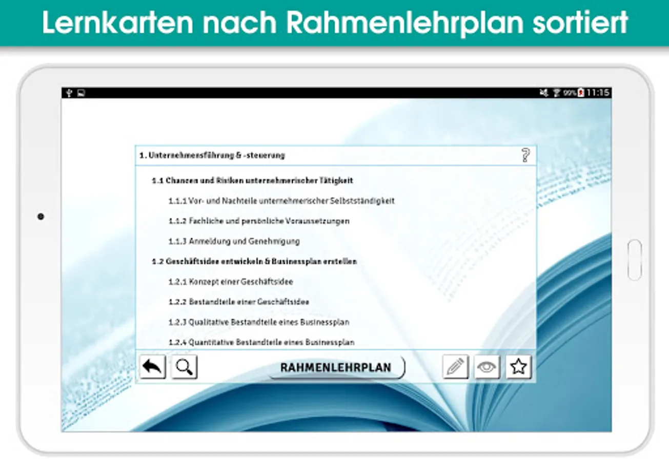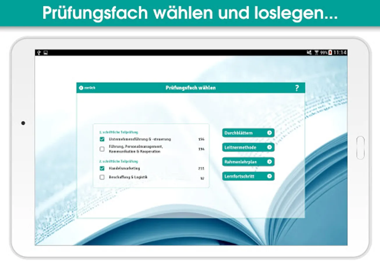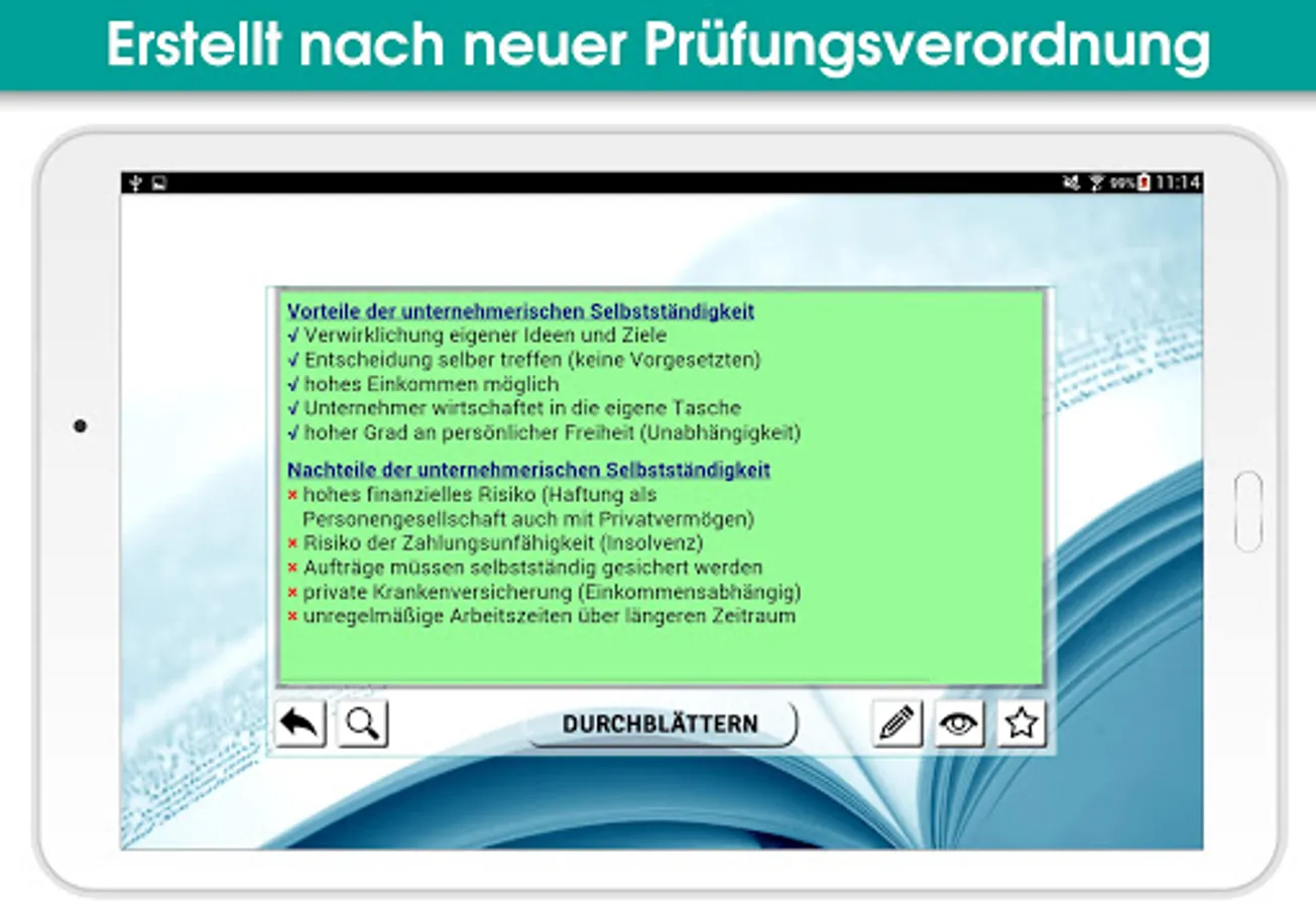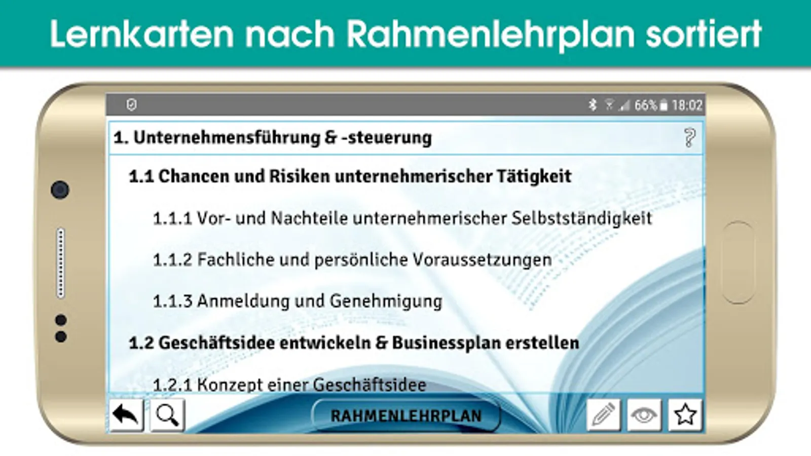This flashcard app is an effective learning tool for all aspiring commercial management specialists and management specialists for sales (retail). It is based on the classic question-answer principle and includes over 650 flashcards that are relevant for the examination to 100%. The contents of flashcards was created in accordance with the currently valid curriculum IHK (VO2014) and take into account the entire examination material in recent years.