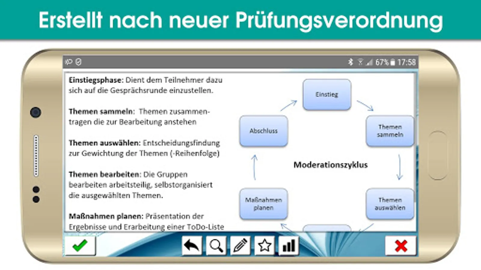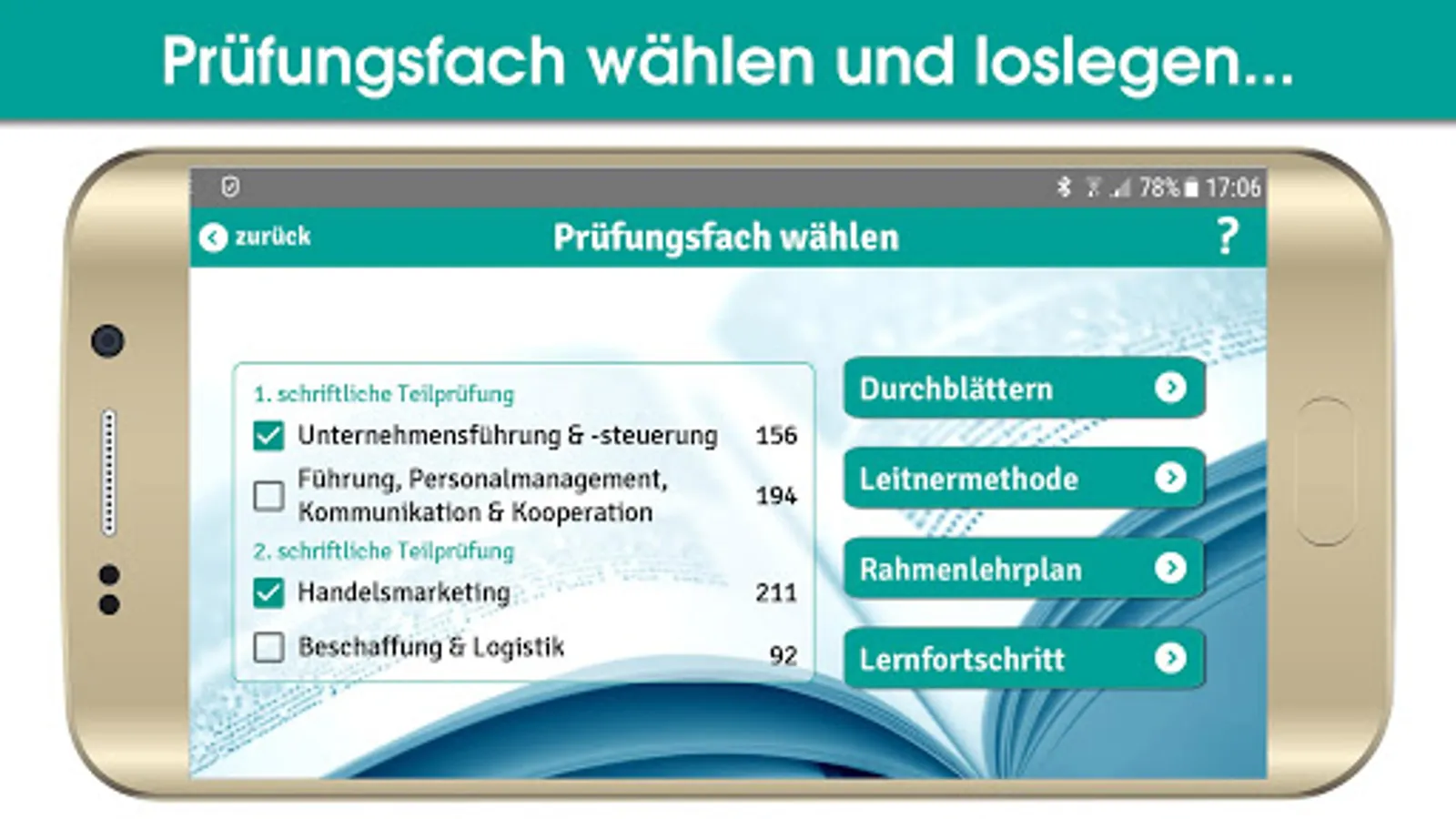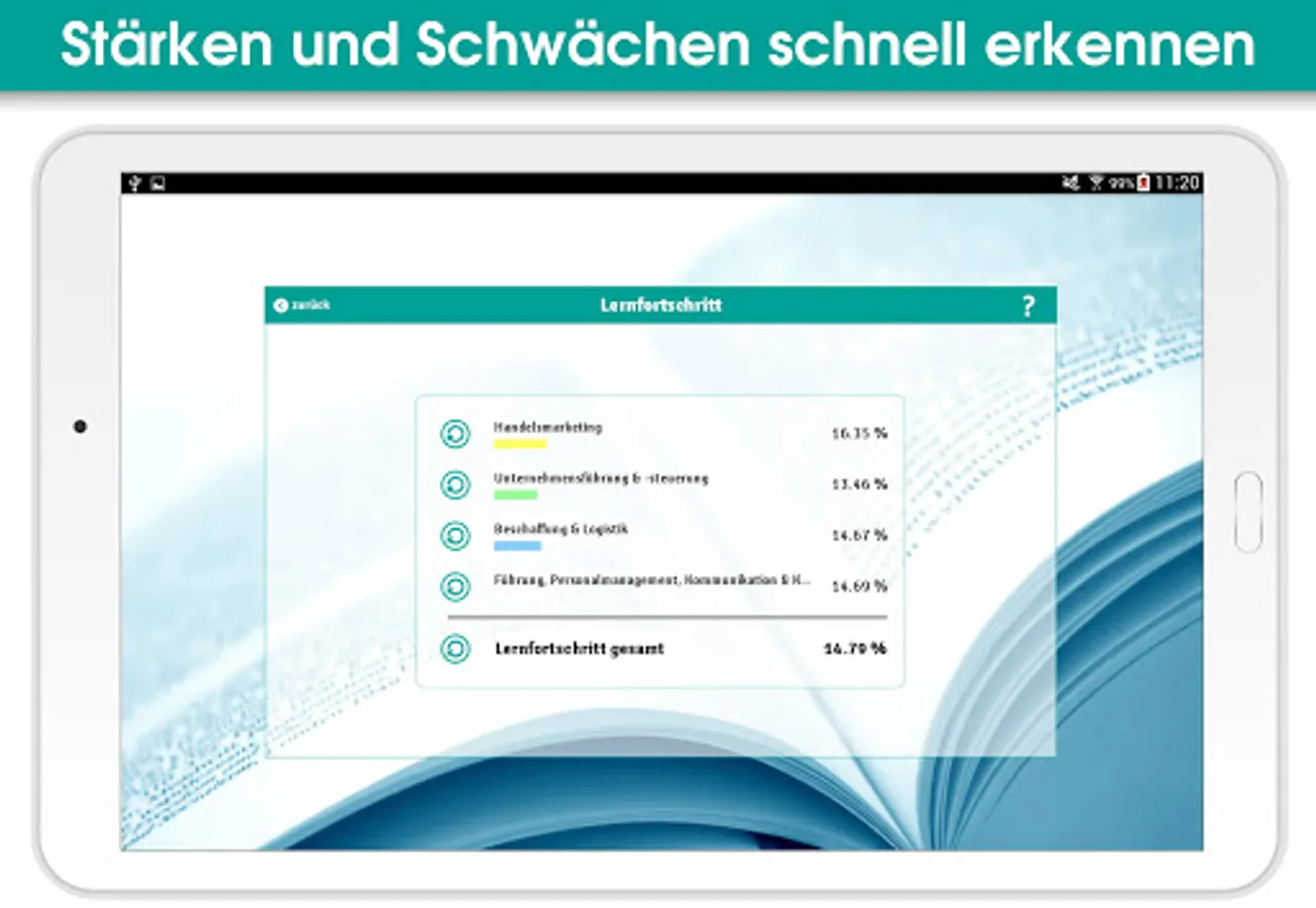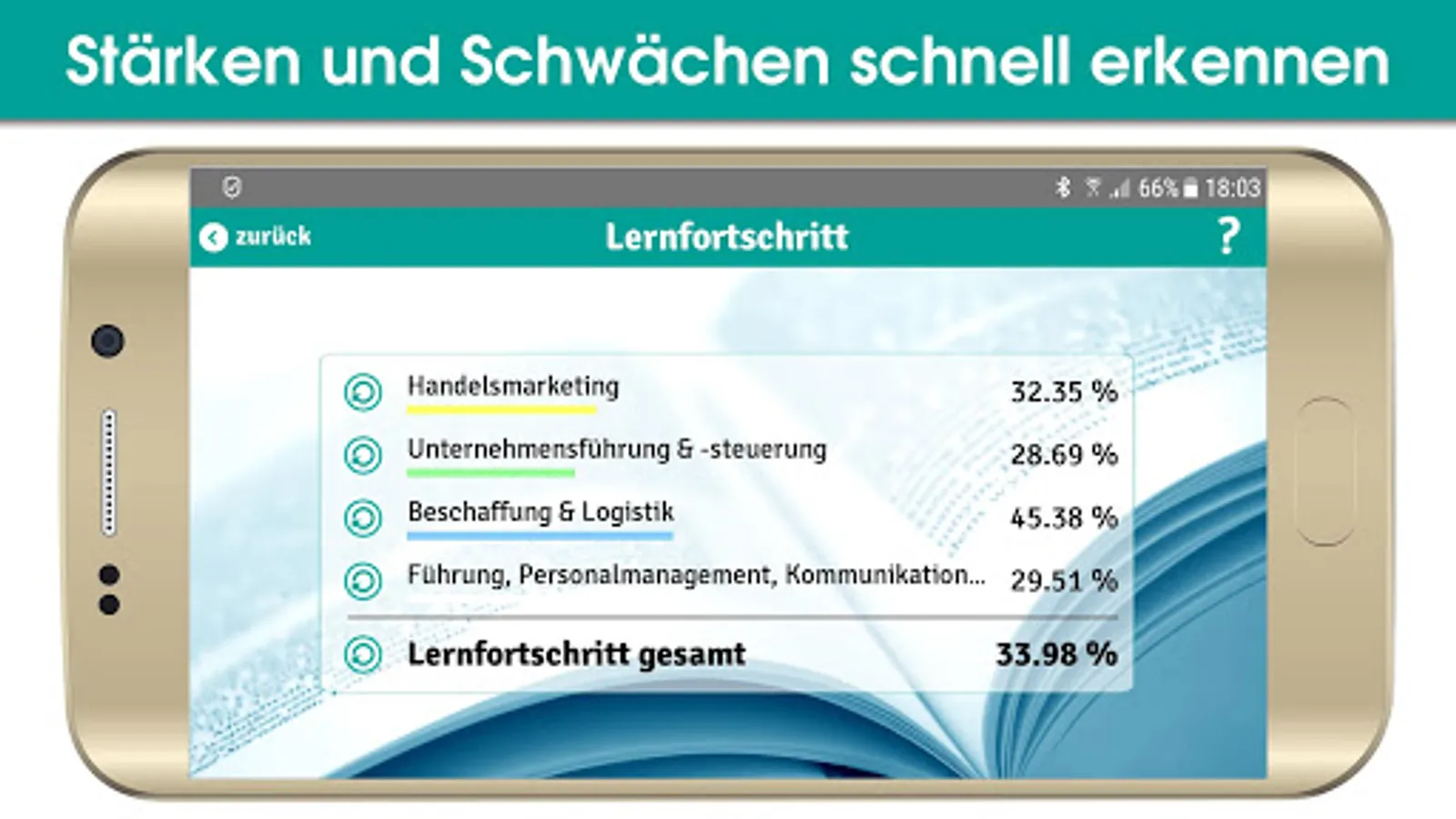 This flashcard app is an effective learning tool for all aspiring commercial management specialists and management specialists for sales (retail). It is based on the classic question-answer principle and includes over 650 flashcards that are relevant for the examination to 100%. The contents of flashcards was created in accordance with the currently valid curriculum IHK (VO2014) and take into account the entire examination material in recent years.