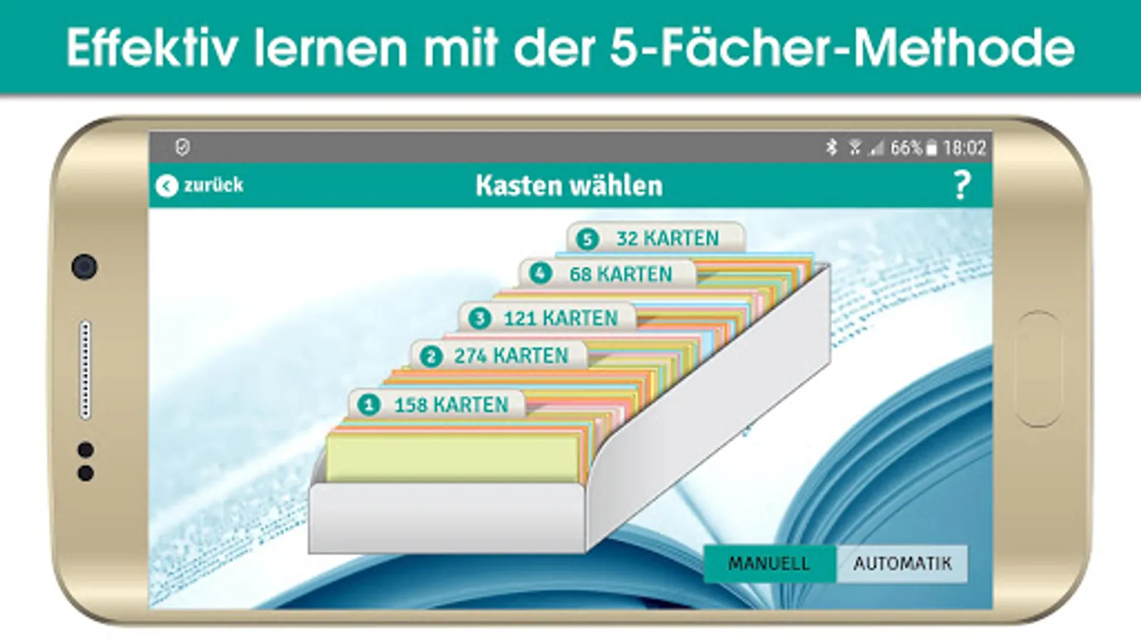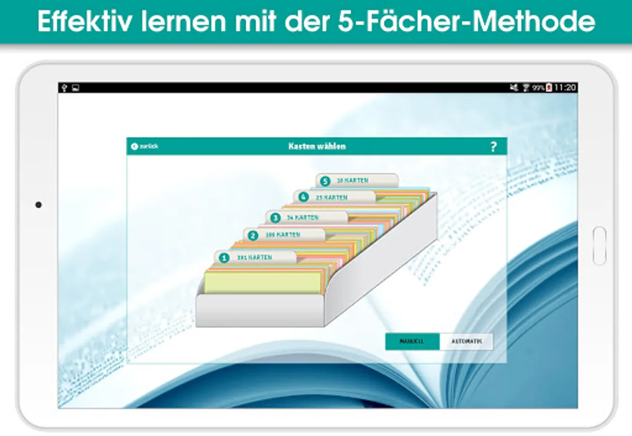 The app works with multiple learning modes. For one, you can easily scroll through itself and save any flash cards specifically in a list all the contents. Secondly, the learning promises to the proven Leitner method (5-Bin principle) the best possible learning experience. With the integrated search function you can find specific important subject matter. In addition, the learning progress can be checked via the statistics at any time. Possible weaknesses are detected at fast!