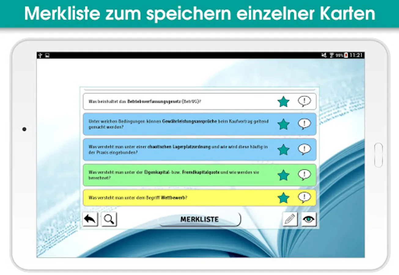 Although the contents of Handelsfachwirt flashcards app covers much of the necessary knowledge, it is recommended that the books received, text books or scripts of the respective course provider carefully to read content to understand the context. By additionally conscientious learning with the help of this app a successful conclusion to the tested Handelsfachwirt IHK nothing stands in the way.