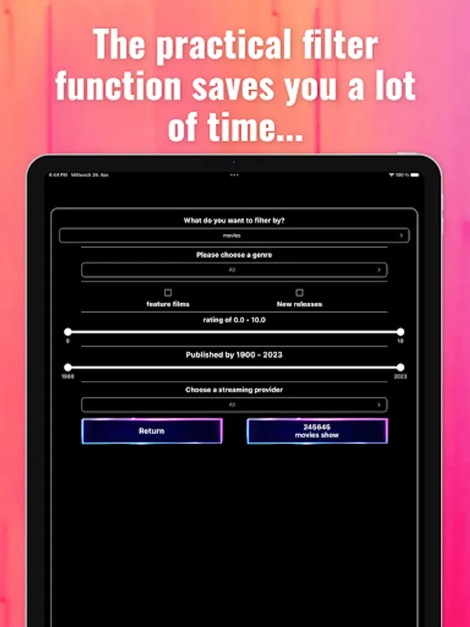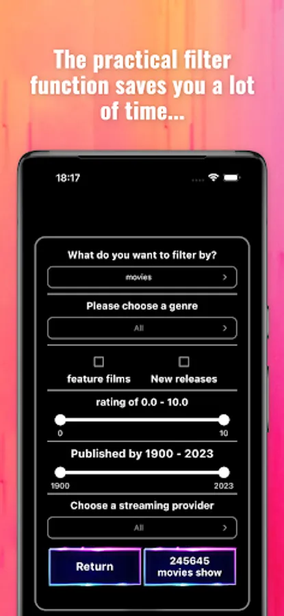 With the practical filter functions, you can optimise your search by, for example, your streaming providers, genres, year of release, rating and much more....