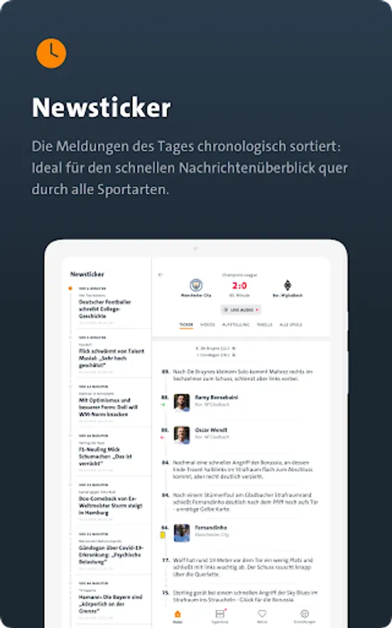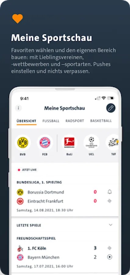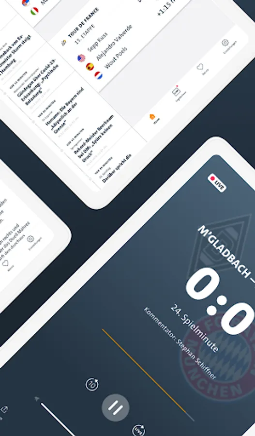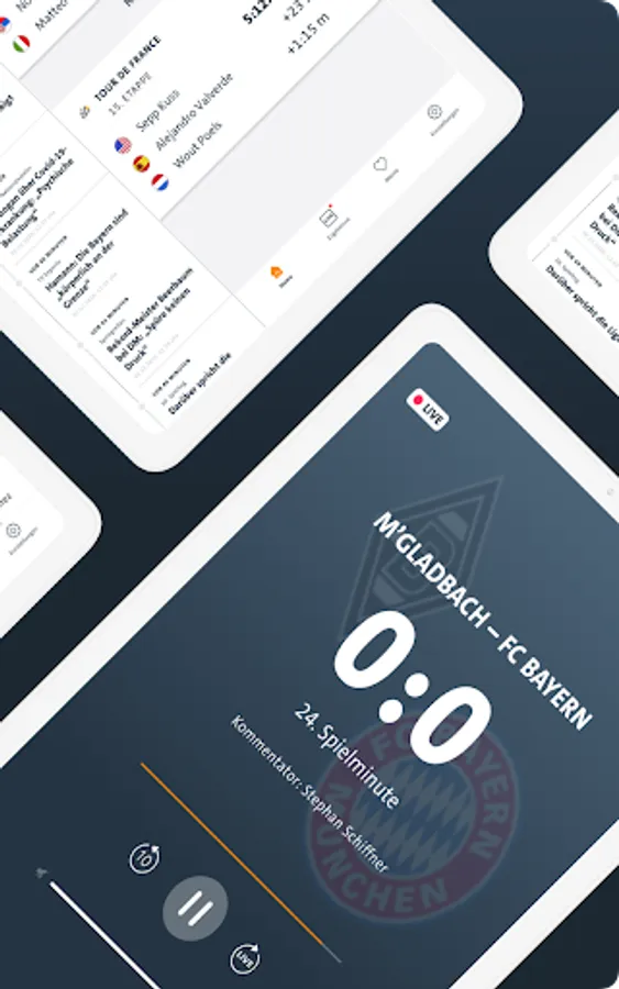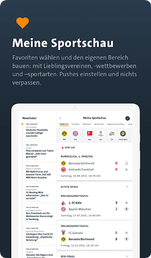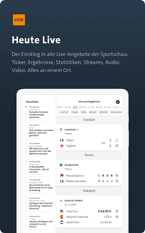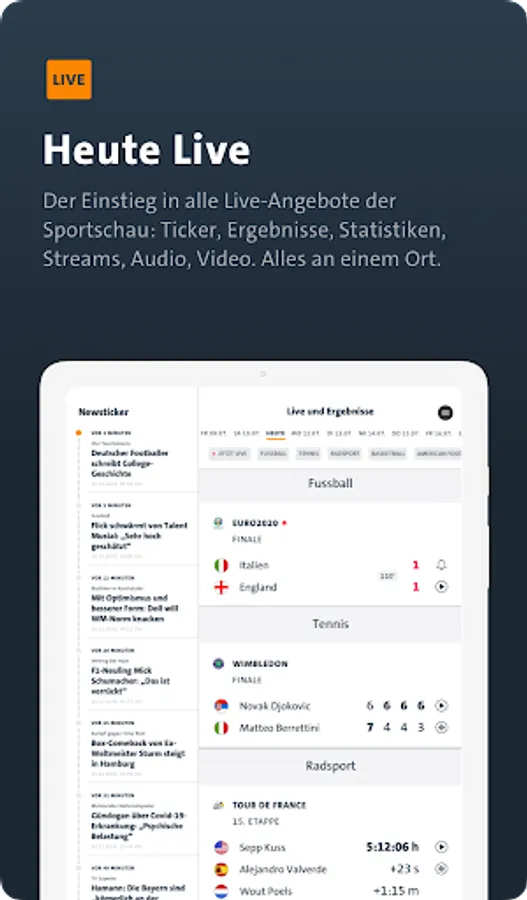 The sports show app provides you with the most important news and background information from the world of sports. With our live tickers, live audio streams and video streams, you won't miss a thing - not a goal in the Bundesliga, not an overtaking maneuver in Formula 1 and not a breakball in tennis.