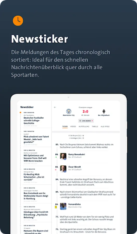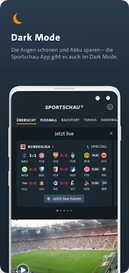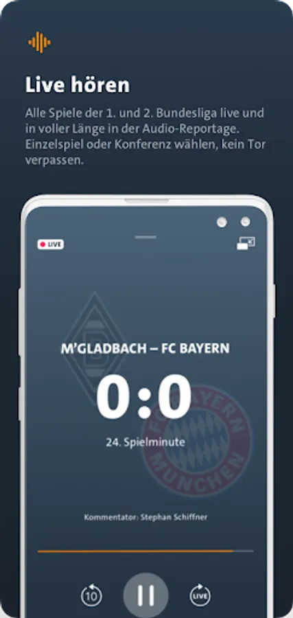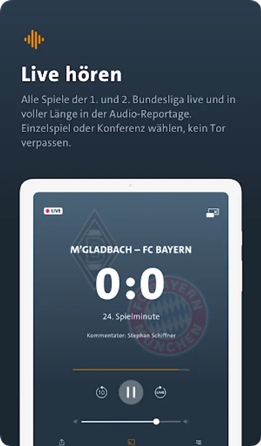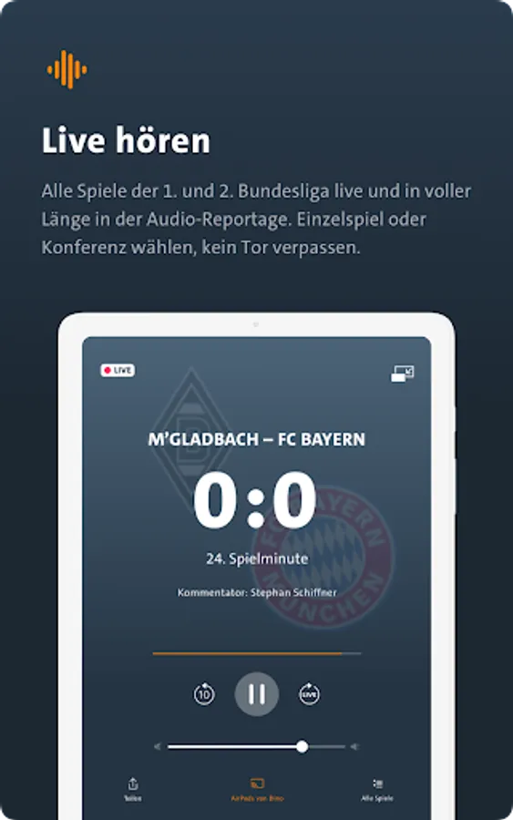 Are you on the road and your club is playing in the Bundesliga? Then listen to the game in full length and without interruptions in the audio report. We broadcast every game from the 1st and 2nd Bundesliga from the first to the last minute. You can find the stream, the associated live ticker and lots of statistics about the game in one place - just click on the game in the live area.