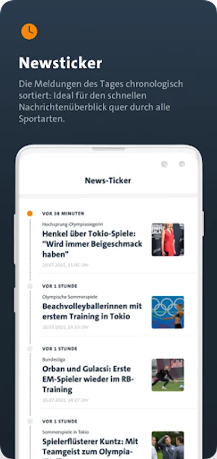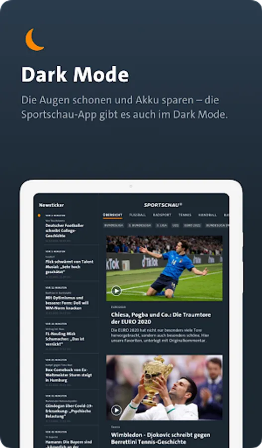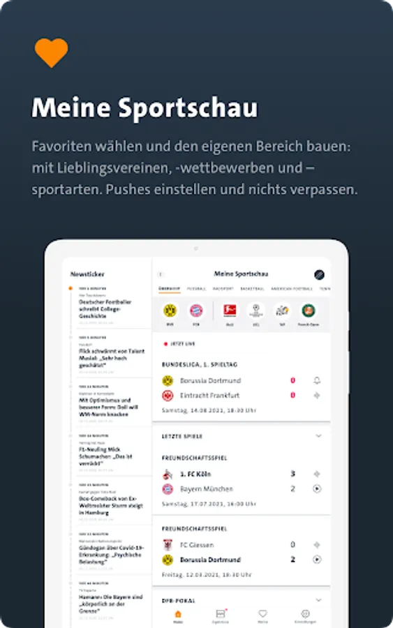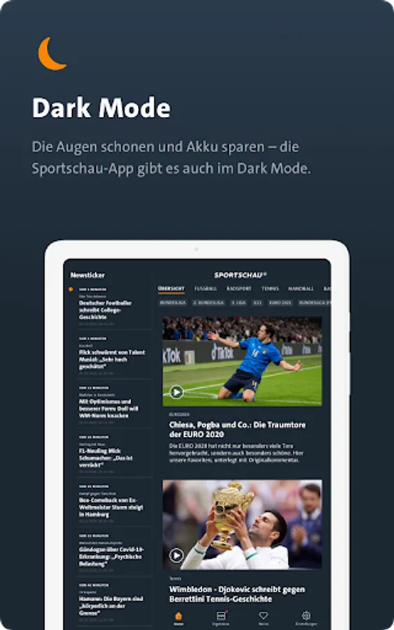 As usual, the "Home" area contains all the important information and background information, selected by the Sportschau editors. On the overview there is a general overview of all sports, swipe to the right to get specific information about individual sports.