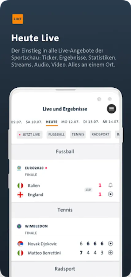 In the "Live & Results" area you can see directly what is important today: Which matches have already taken place? Who is playing tonight? And what's live right now?