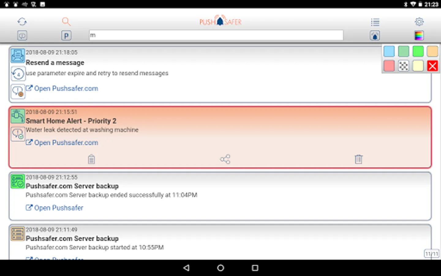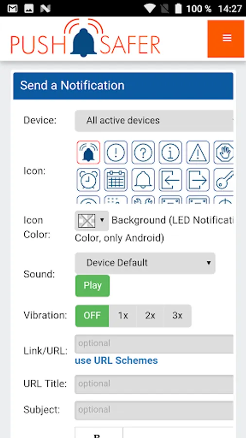 You can set up your notification by changing title, message, icon, icon-color, RGB LED-Color, sound, vibration, url, url title, time to live, priority, retry, expire, confirm, answer!