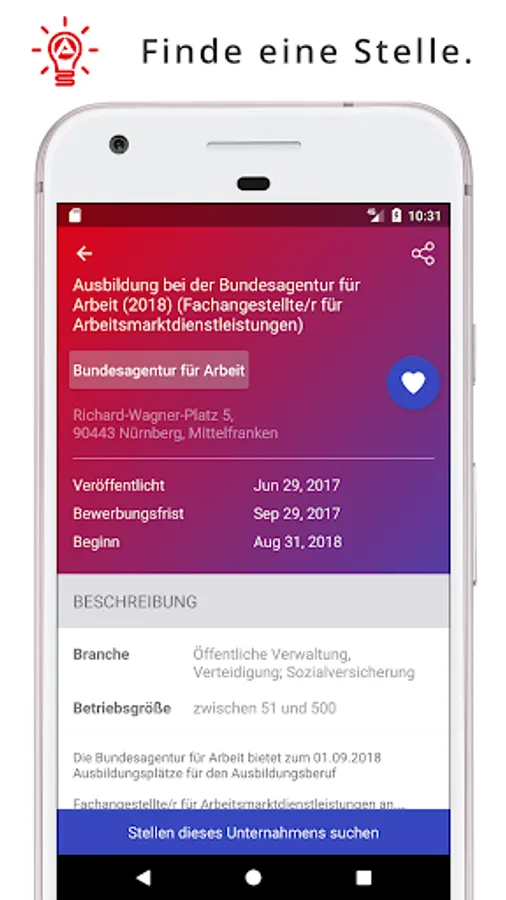 • Details on an apprenticeship position, e.g. requirements, direct contact with the employer & contact person. Save current searches to regularly search for new training positions.