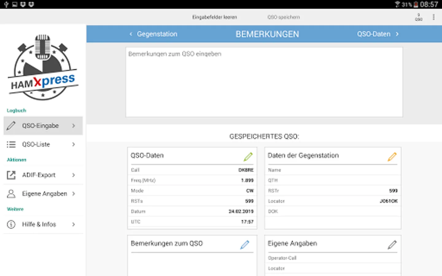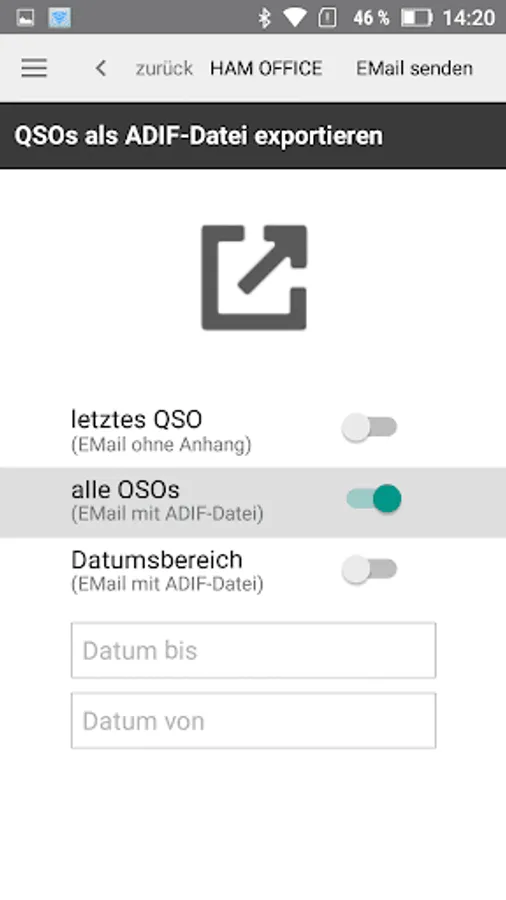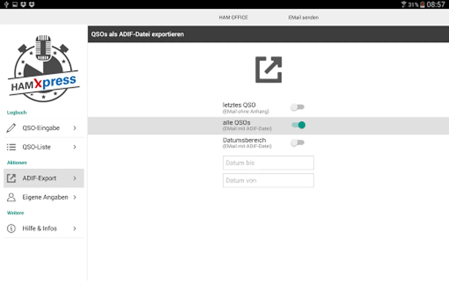 On mobile devices, you can send the export file immediately by email, the PC is the export file on the desktop. HAM Xpress can also connect to my logbook with HAM OFFICE and send the QSOs directly to the logbook.