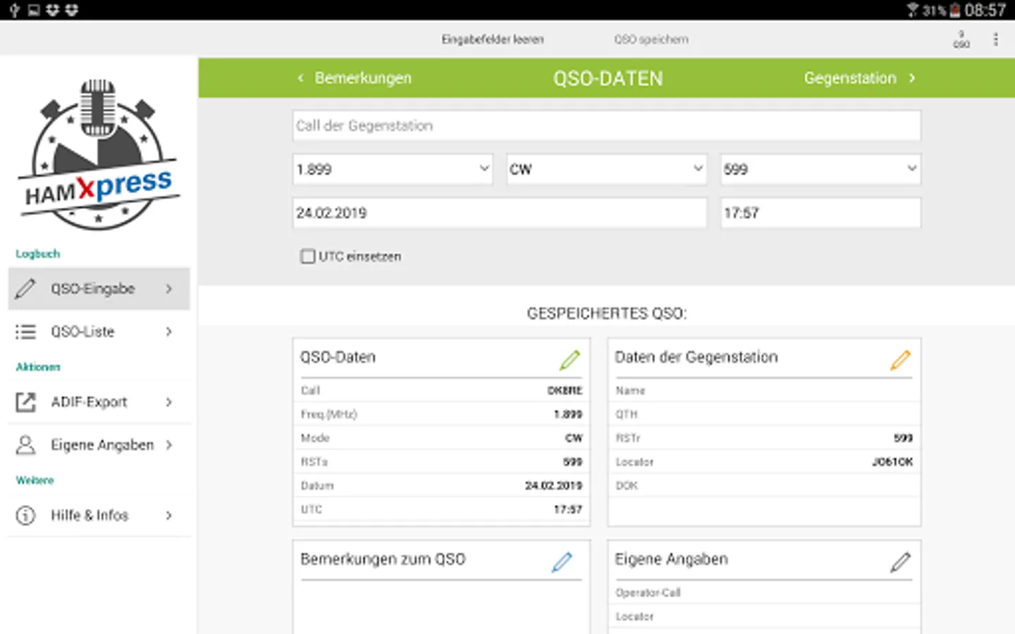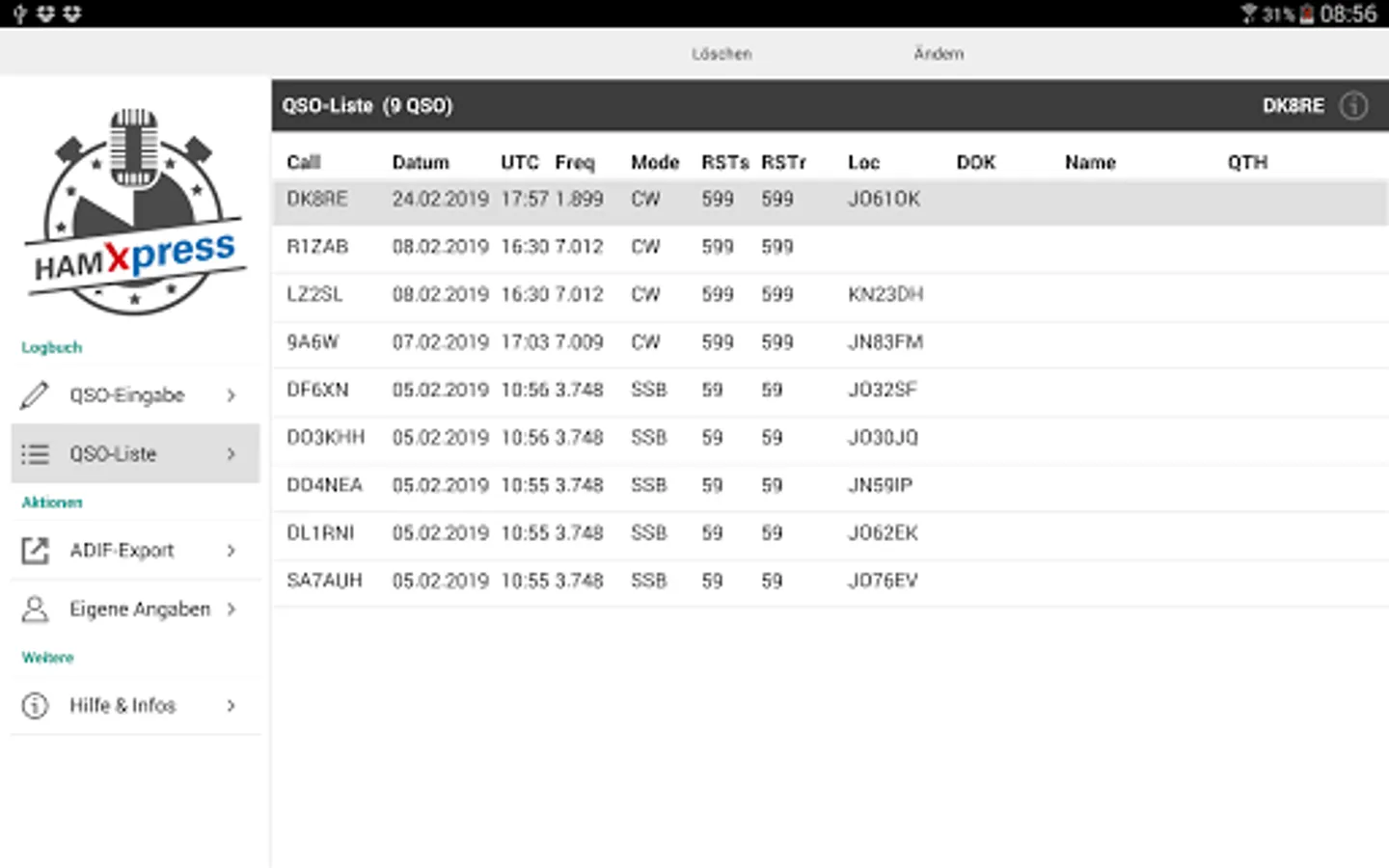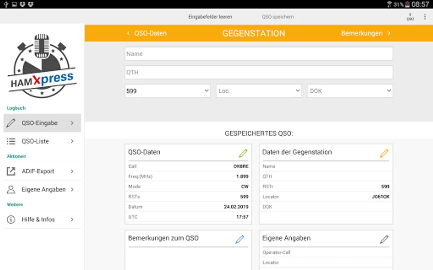 On mobile devices, you can send the export file immediately by email, the PC is the export file on the desktop. HAM Xpress can also connect to my logbook with HAM OFFICE and send the QSOs directly to the logbook.