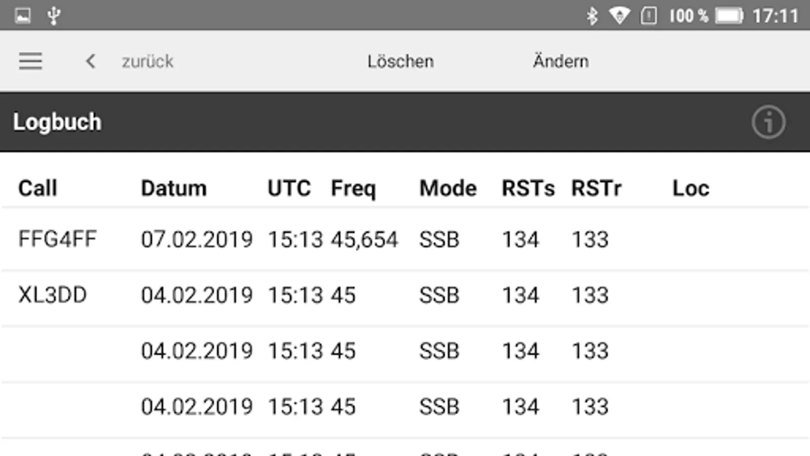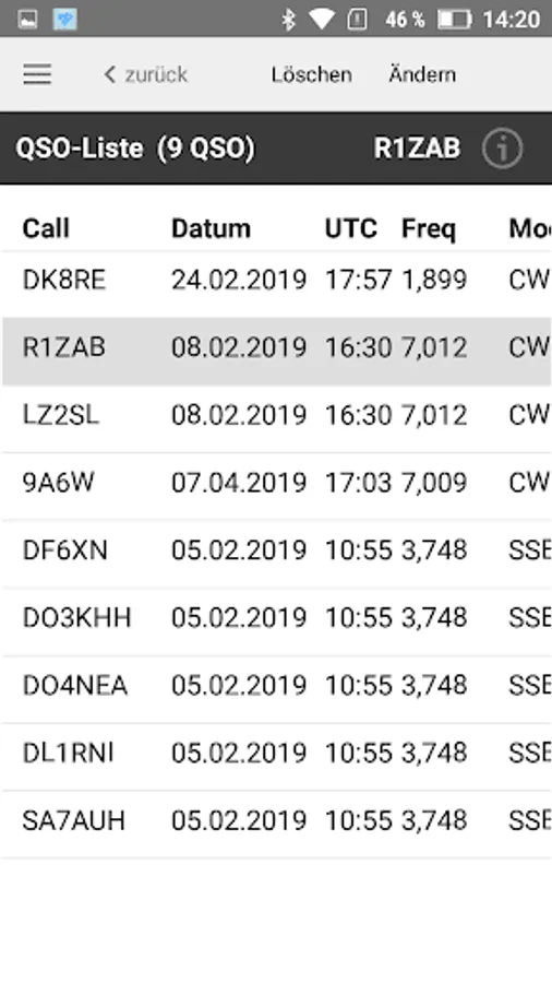 Here you can click on an entry on the i-button to see more information about the QSO. The button bar contains buttons for deleting and changing a QSO.