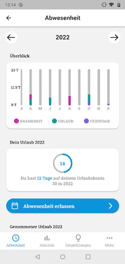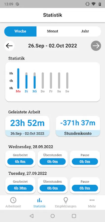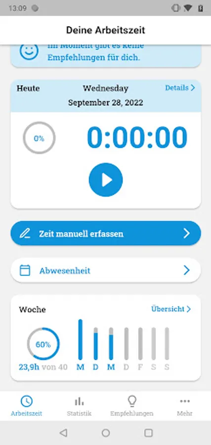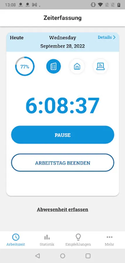 You can record your working hours, your place of work and your breaks. The app shows you your personal working time dashboard with all relevant information. You can export the data at any time and send it to your employer if necessary.