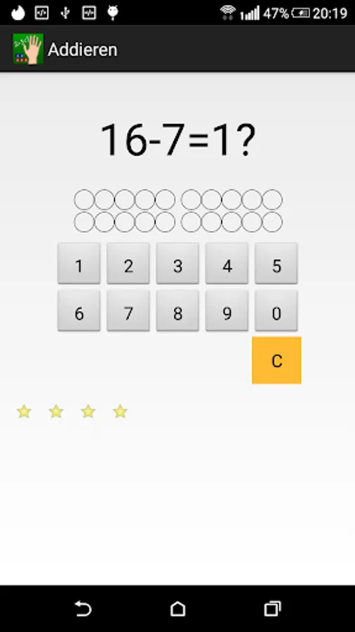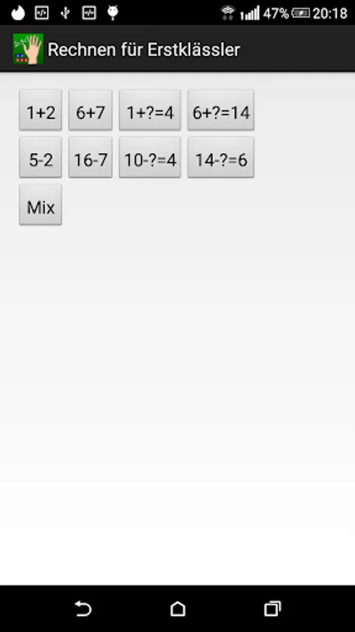 I first wrote the app for my own children. In order to avoid the frustrations the children should already be able to master the calculation themselves. So the mathematical symbols (+ - =) must be known. The app should be introduced and used together with parents. Please try out the app first.