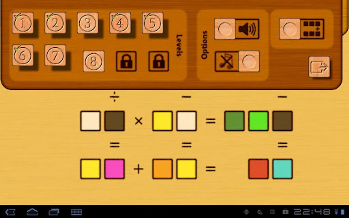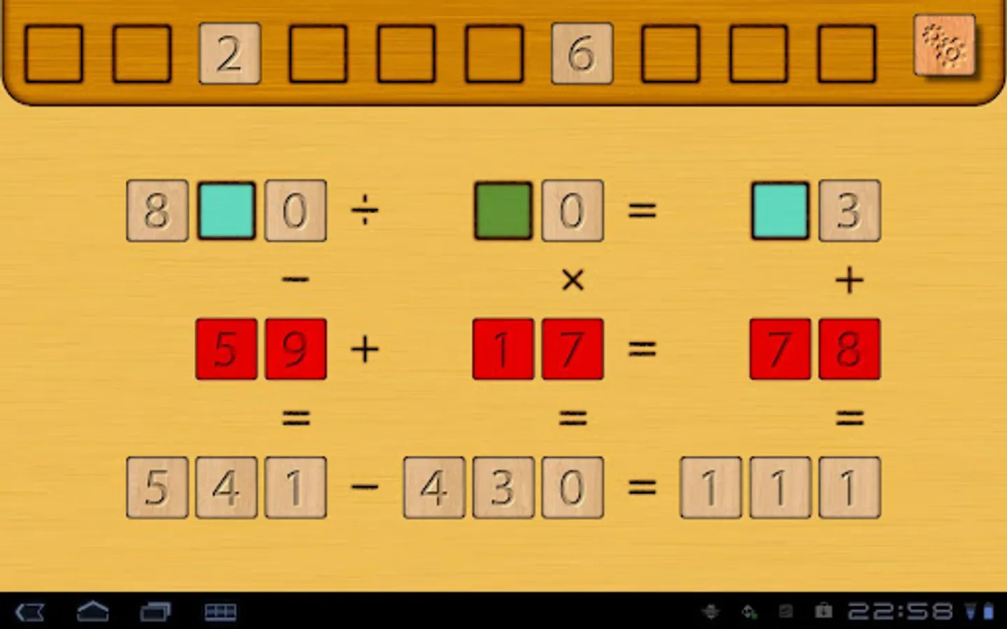 From a system of equations all digits have been removed and shall be reconstructed. To do so, you can drag and drop digit tokens to colored fields. Fields of identical color shall be occupied by identical tokens. Vice versa tokens of the same digit must not be played on fields with different colors.