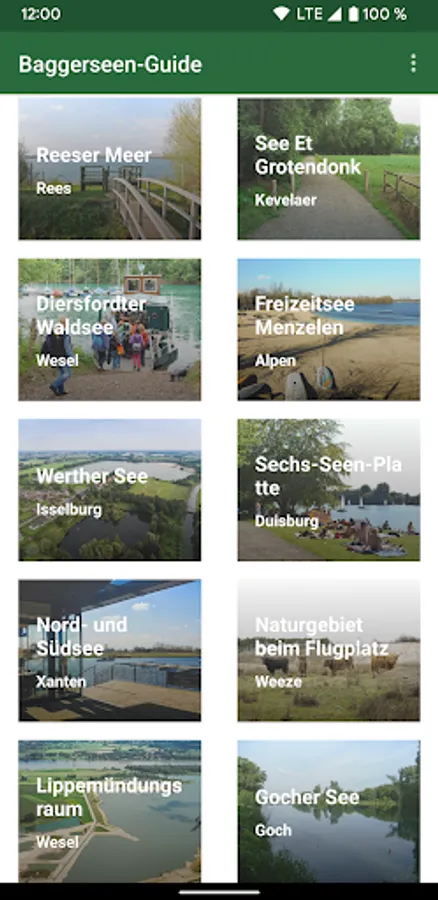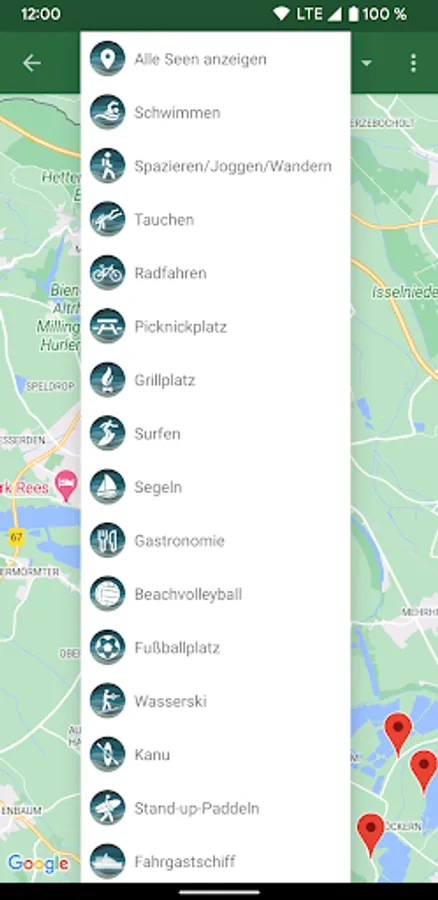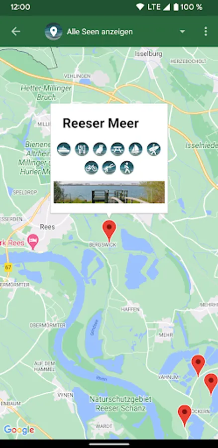 Card option: Get show all lakes and recreation areas on the Lower Rhine on a map. Once you've enabled location feature on your smartphone or tablet, you can see which of the 18 recreational places is in your immediate vicinity.