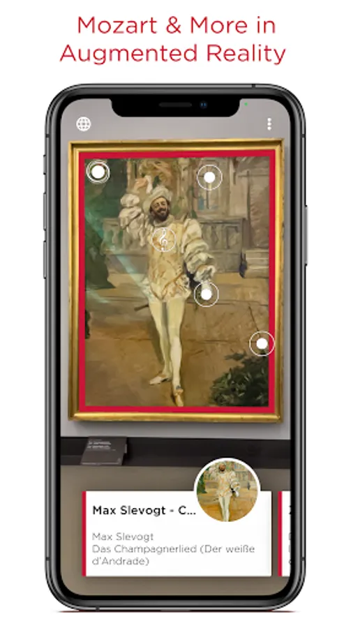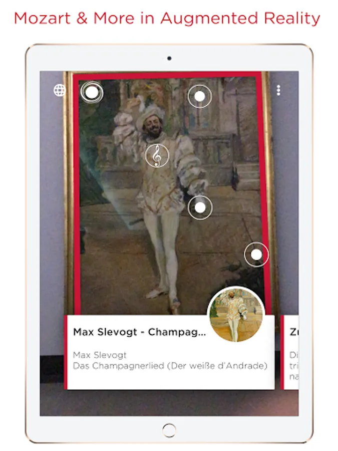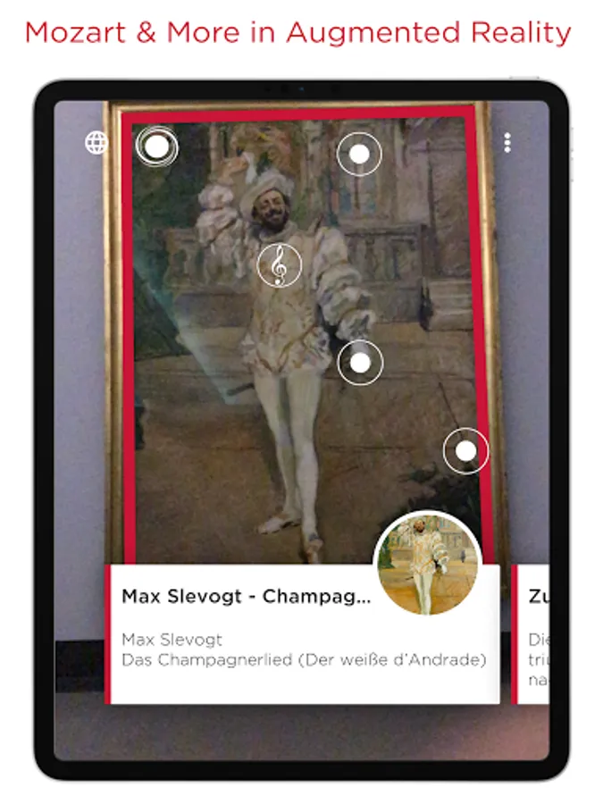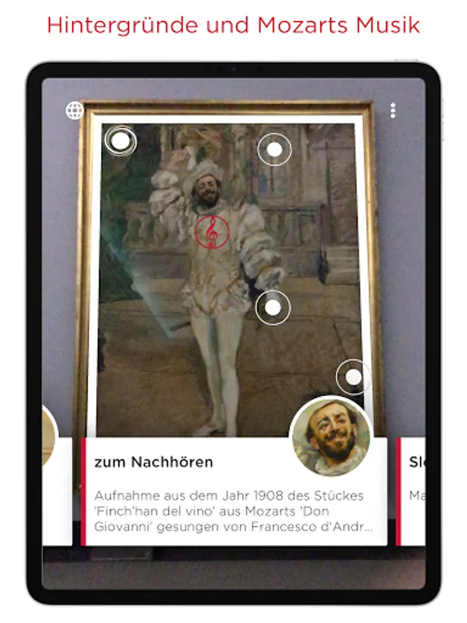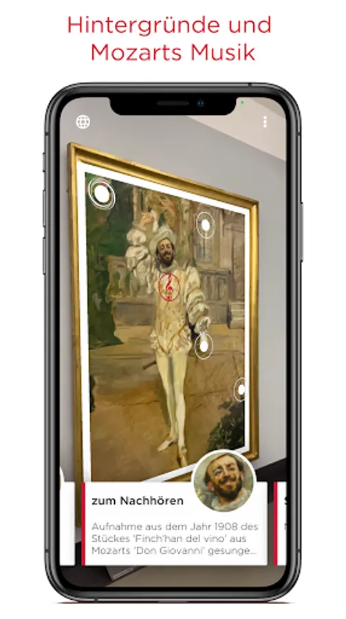 Experience the exhibition IMAGINE MOZART | MOZART BILDER audiovisual with the augmented reality app "Mozart & More"! Simply hold your smartphone or tablet over the exhibits and find out more about image themes, historical backgrounds and Mozart's music in texts, audio and video examples. (Own headphones are required.)
