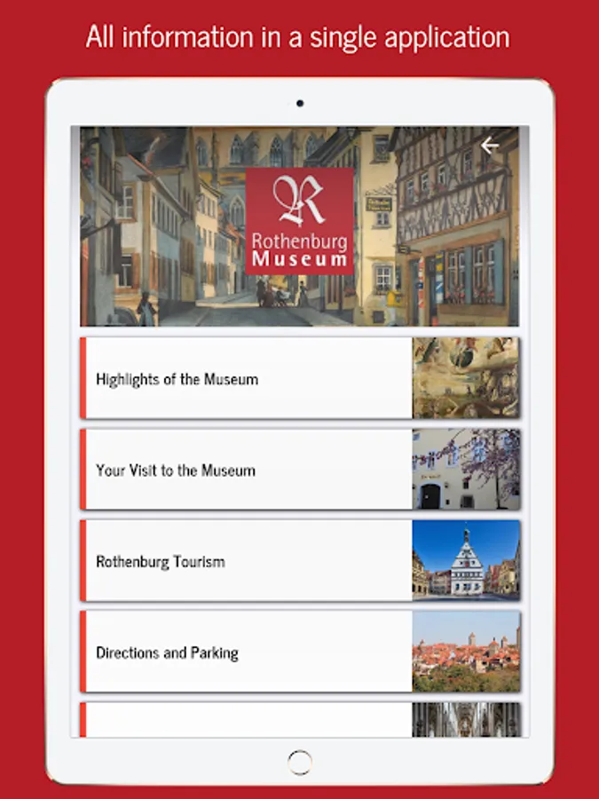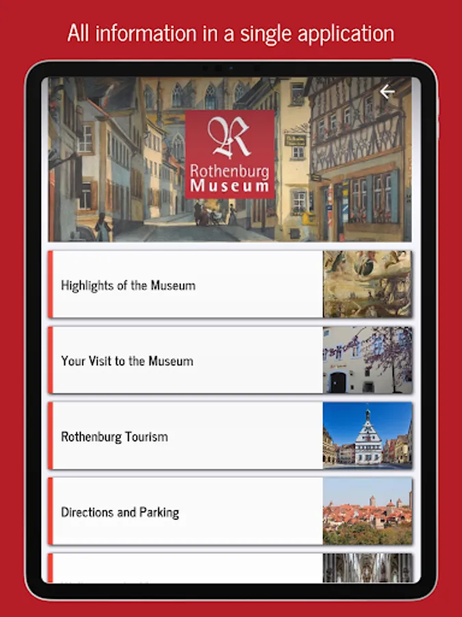 The "RothenburgMuseum" App offers visitors to the museum a new world of culture and education. Experience the unique history of the town of Rothenburg ob der Tauber and immerse yourself deeply in its history.