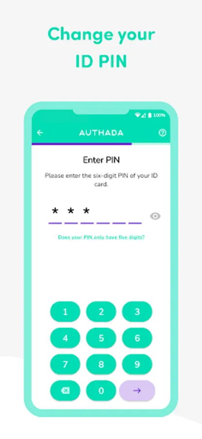 Before using the online ID card function for the first time, you must change your ID card PIN. To do so, you will need the five-digit transport PIN from your PIN letter. With the AUTHADA app and the "Change PIN" function, you can assign a new, personal, six-digit PIN. Therefore, enter your five-digit transport PIN from your PIN letter and then assign the new, six-digit PIN. In future, you will always need this PIN if you want to use the online ID card function.