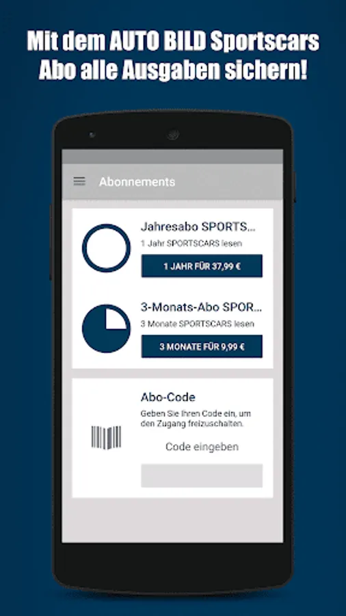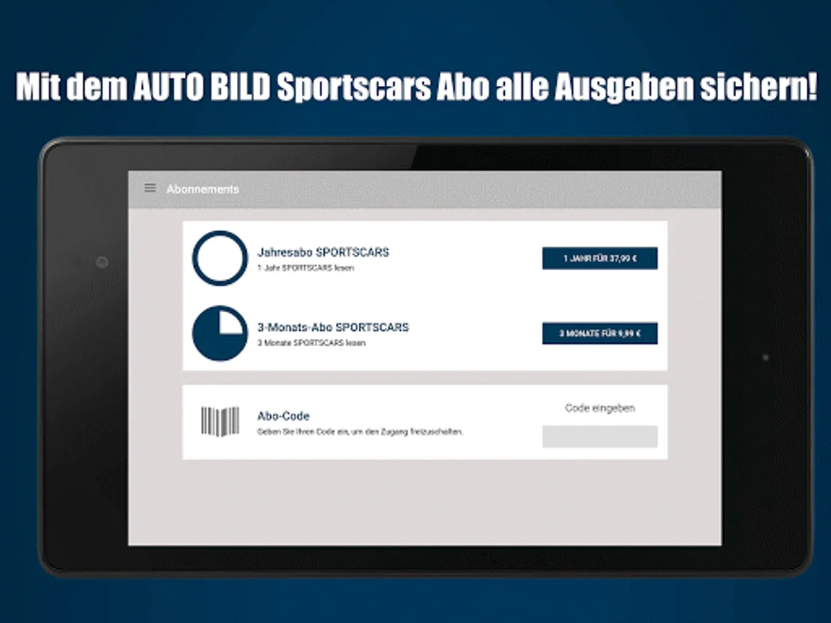 1. Download the AUTO BILD sportscars Reader app to your tablet or Smartphonr down.