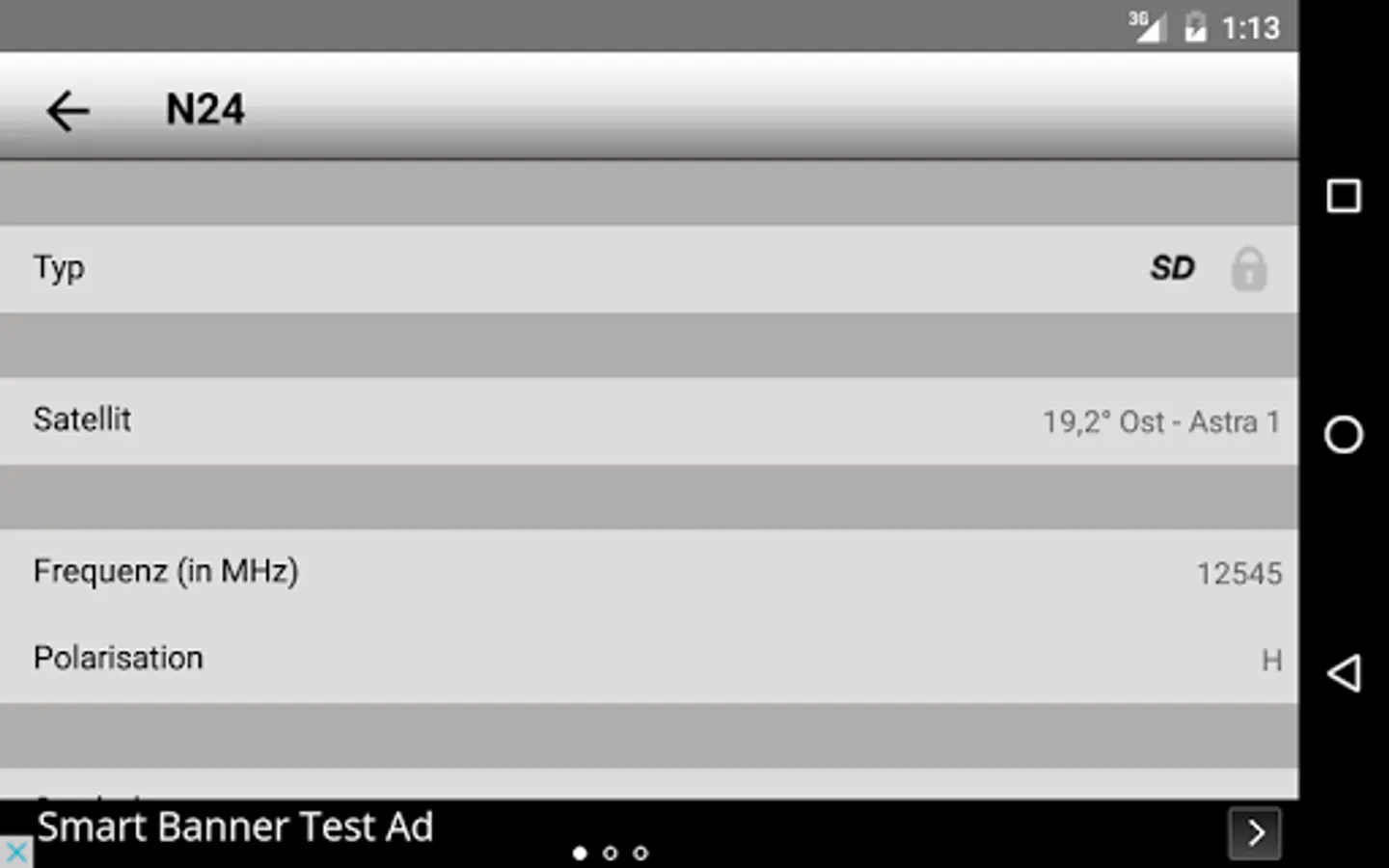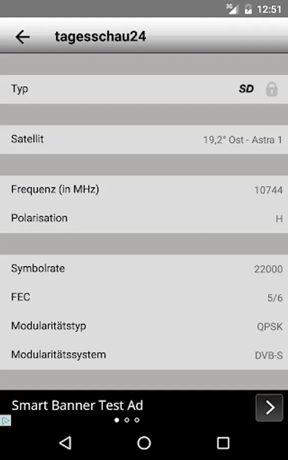 The frequency monitor lists the station name, frequency, polarization, symbol rate, FEC, Modularitätstyp, Modularitätssystem, provider SID, VPID and APID. Sorting by sender name and search it easier to locate the transmitter. The list can be filtered by HDTV, Radio, 3D and SD.