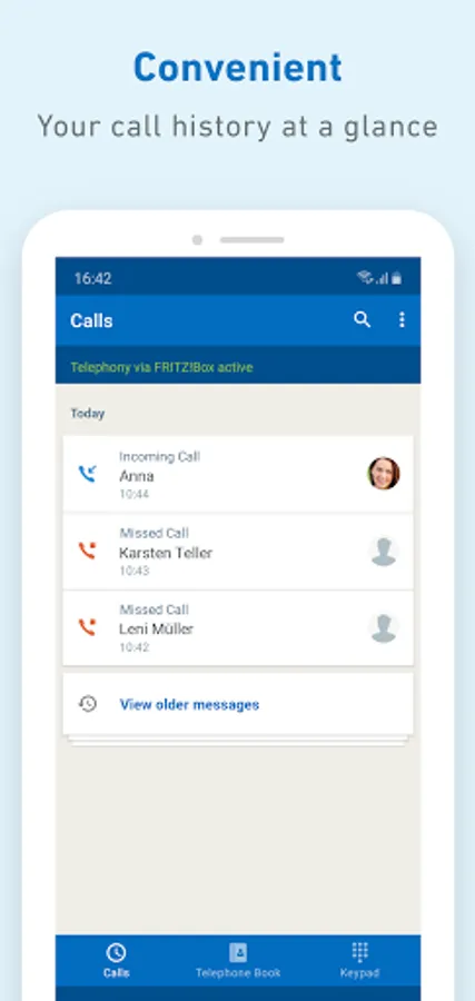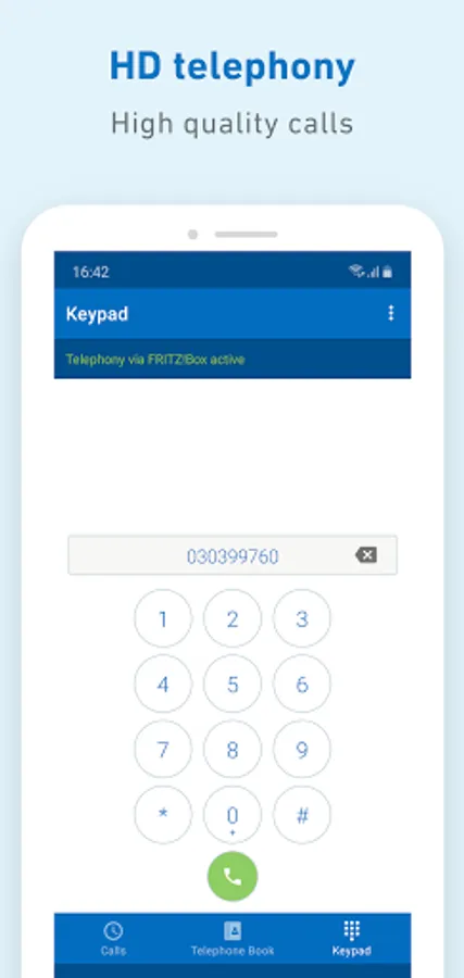 Make calls at home conveniently using your smartphone over your landline telephone numbers - anywhere in the Wi-Fi network of your FRITZ!Box. With the FRITZ!App Fon you benefit from the landline rates; for many providers even from flat rate telephony. HD telephony provides for crystal clear voice quality. Thanks to support for Bluetooth headsets you can enjoy complete flexibility for everyday calling and for working from home. The latest technologies mean that the FRITZ!App Fon works invisibly in the background no matter what the battery status.