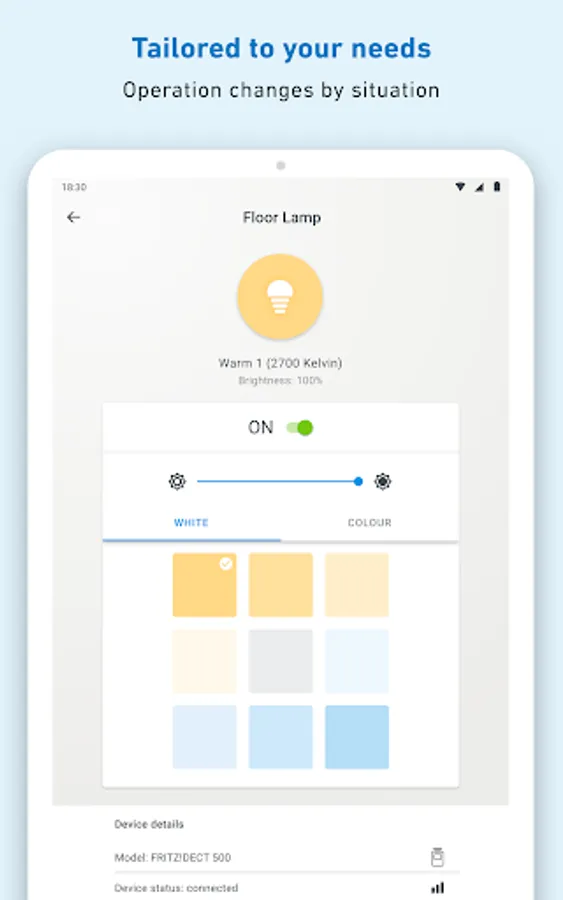 - use the FRITZ!DECT 500 LED light to provide for a feel-good atmosphere in the evening, and stimulating lighting in the morning.