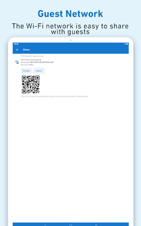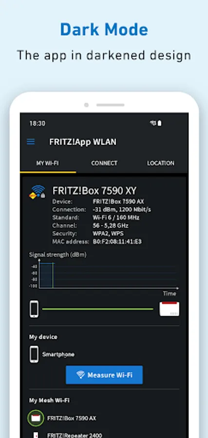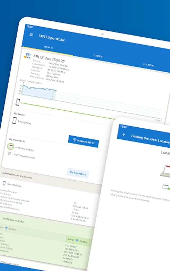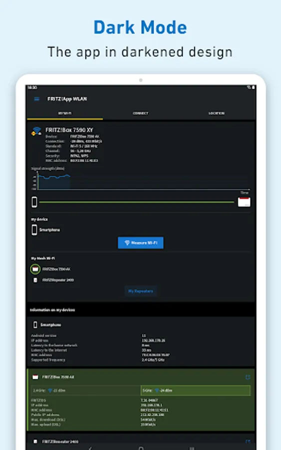 With FRITZ!App WLAN you can keep an eye on your wireless network at all times. Use the FRITZ!App WLAN for an easy connection from your Android smartphone or tablet to the wireless LAN of your FRITZ!Box or any other WLAN router. The FRITZ!App WLAN also provides you with useful details about the existing wireless connection. A graphic diagram presented in the FRITZ!App WLAN offers you additional transparency about the channel assignments of the various devices in your wireless LAN environment.