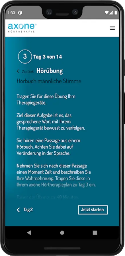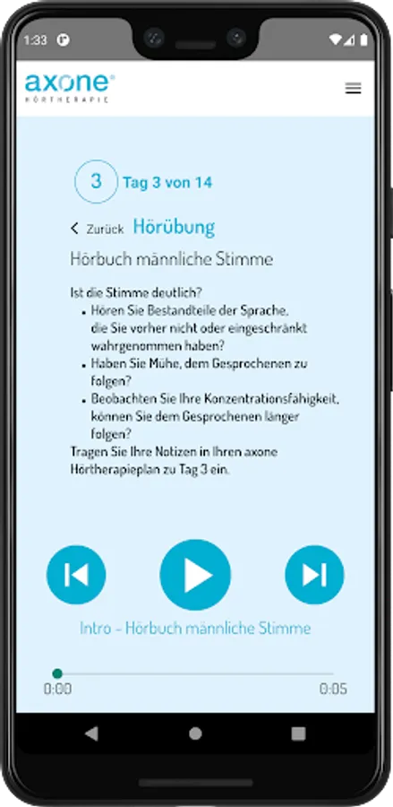 With axonic hearing therapy, we intend to reactivate the connections in the brain responsible for hearing as much as possible. The 14-day training concept is structured with various listening exercises in such a way that it can reactivate maximum speech understanding in a targeted manner after a short time and improve the processing of various hearing information in the brain.